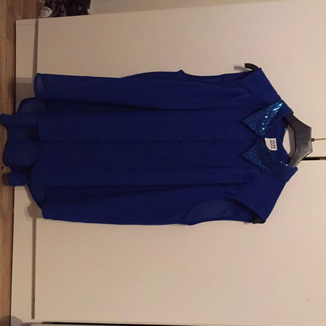 Genomskinlig blå blus med paljetter på kragen. Väldigt skönt och fin använd ett få tal gånger (köpt från Vera Moda) 100kr +frakt (Kan få paketpris vid fler köp av mina kläder)