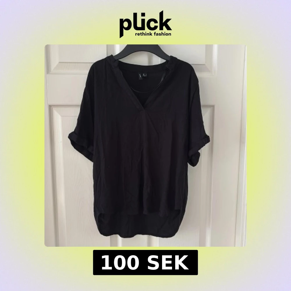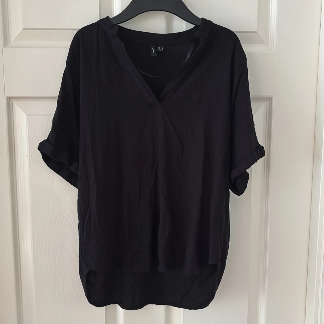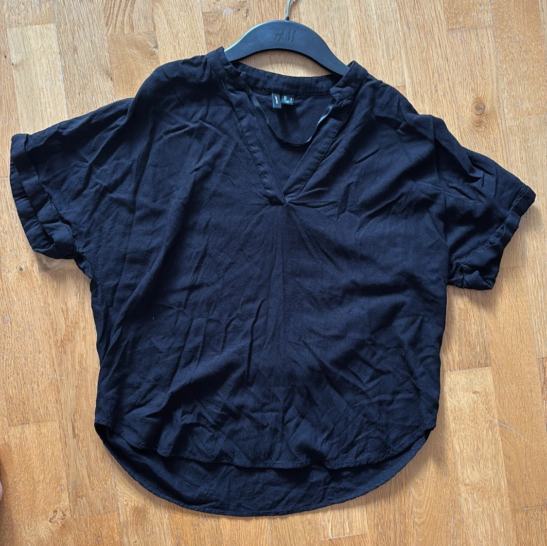 Svart blus från Vero Moda i storlek L med v-ringad hals och korta ärmar. Blusen har en avslappnad passform, uppvikta ärmslut och något längre bakstycke. Perfekt för dig som gillar enkel och stilren design.