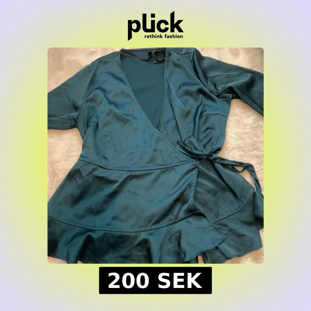 Elegant mörkgrön omlottblus i satin med v-ringad hals och knytning i midjan. Blusen har långa ärmar och volangdetaljer vid fållen, vilket ger en feminin touch. Förgen glr sig röttvis på sista bilden