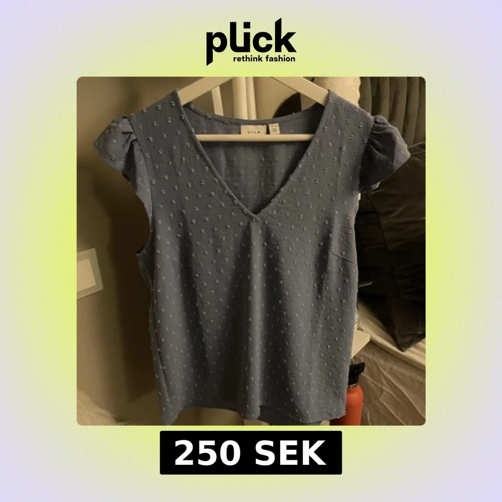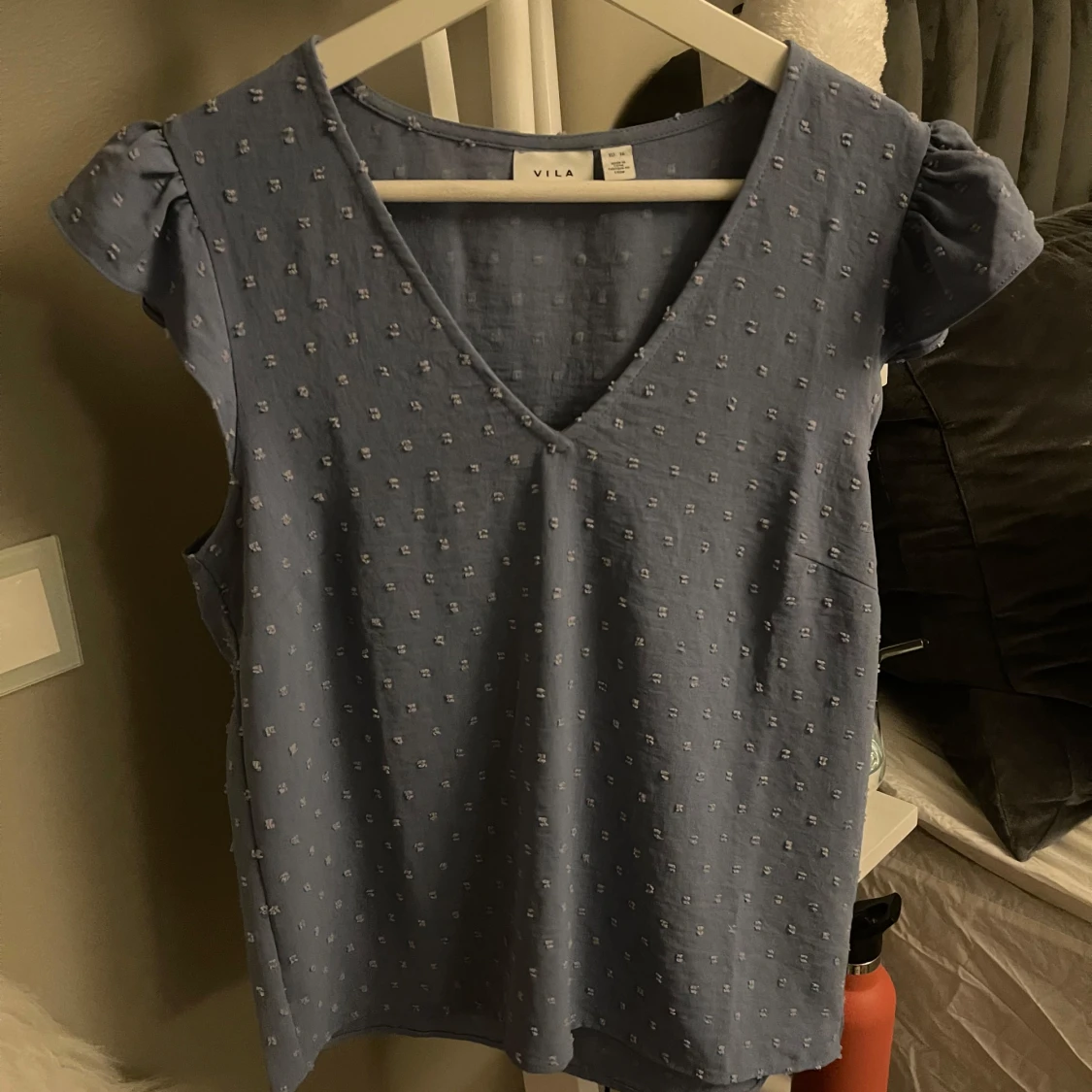 Säljer en söt blå blus från Vila med små prickar och v-ringad hals. Blusen har korta ärmar med volangdetaljer