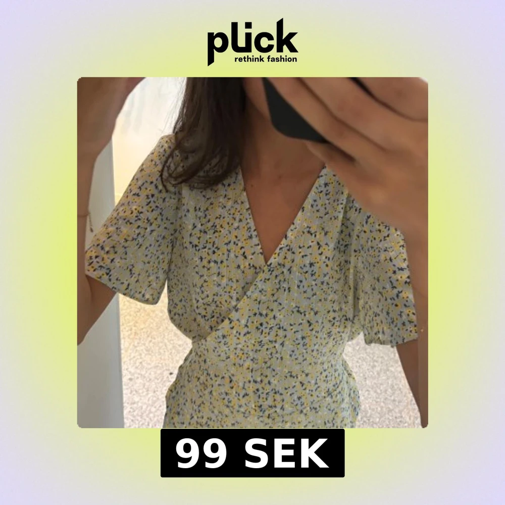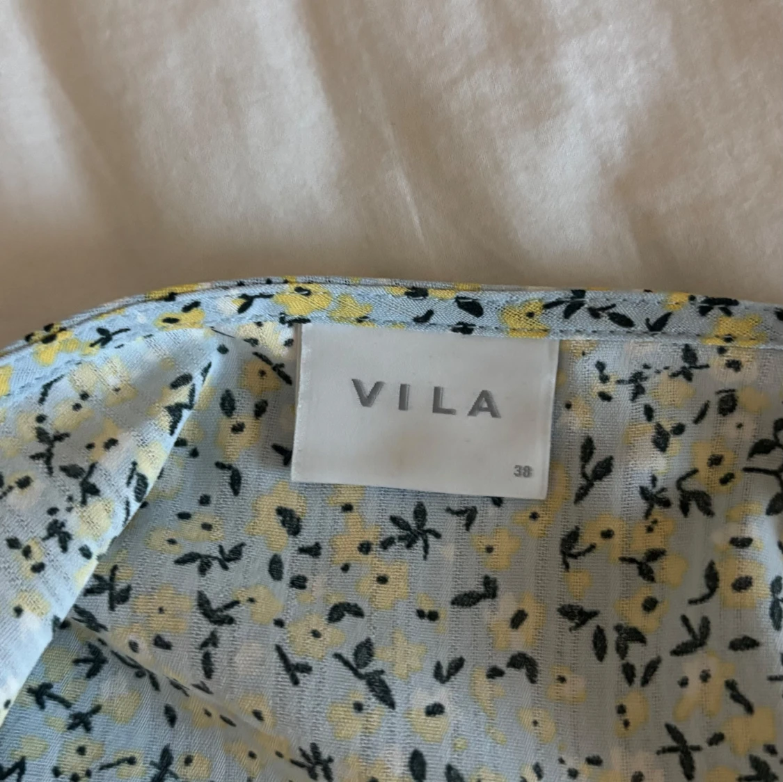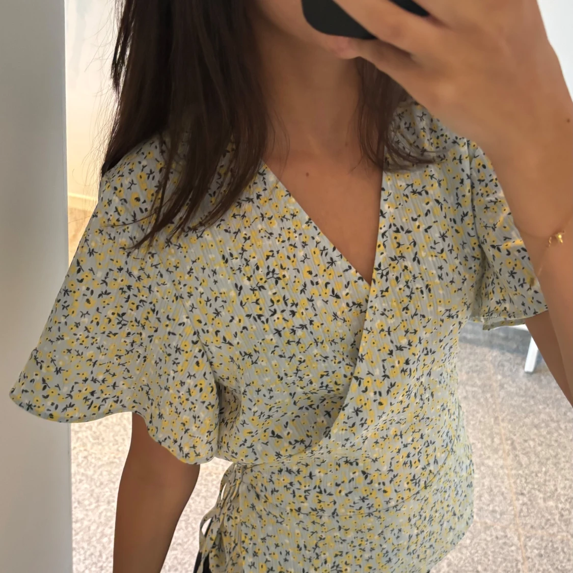 Supersöt kort omlottblus från Vila i ljusblått med små gula och svarta blommor. Blusen har v-ringning, korta ärmar och knyt i sidan. Perfekt för sommarens alla tillfällen, riktigt fräsch och lätt i materialet.