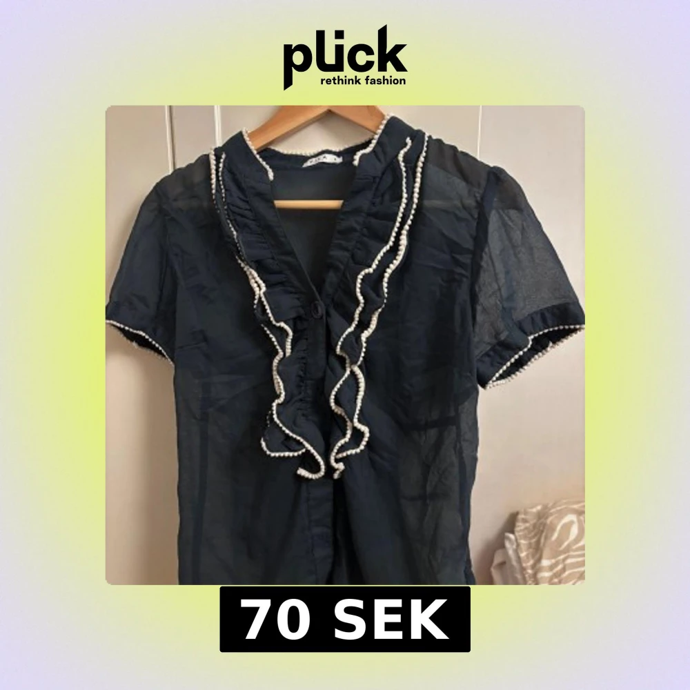 Marinblå, tunn blus från Vila med korta ärmar och vita volangdetaljer längs krage och knappslå. Blusen har en lätt transparent känsla och dekorativa små bollar längs volanger och ärmslut. Perfekt för dig som gillar unika detaljer.