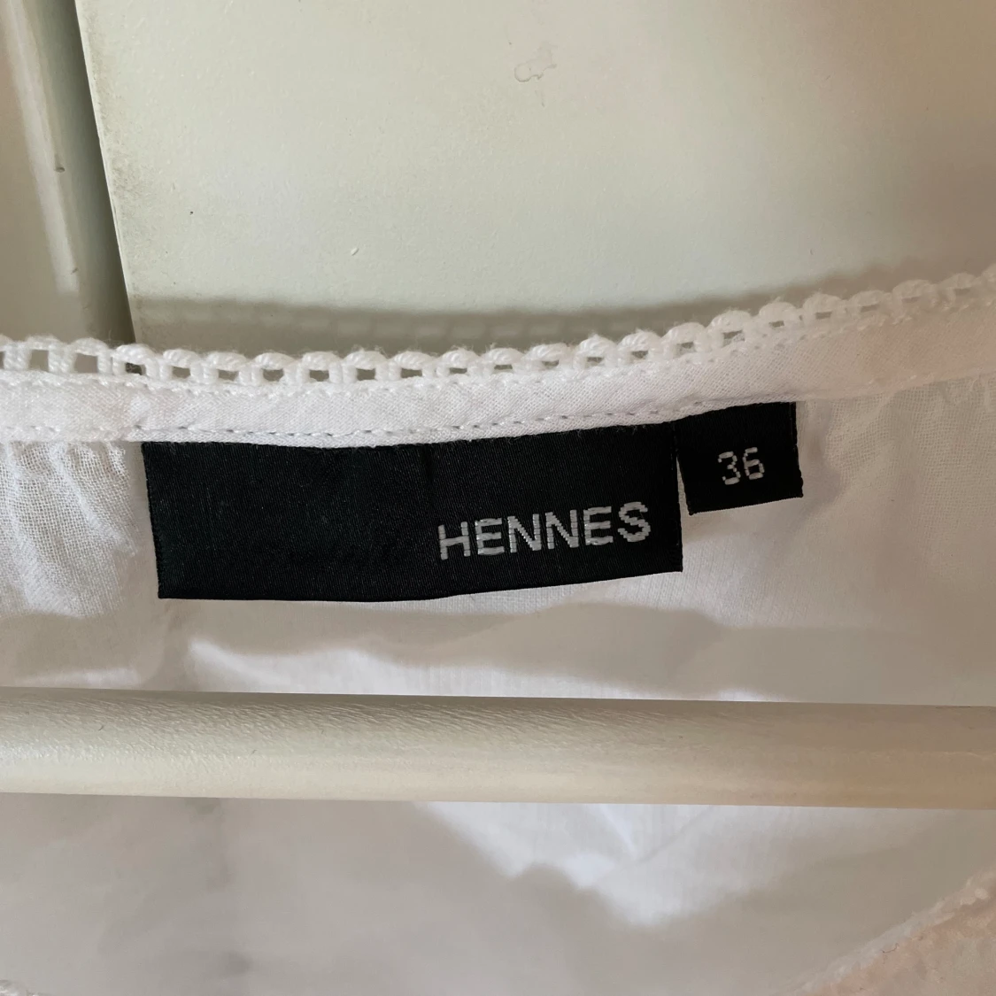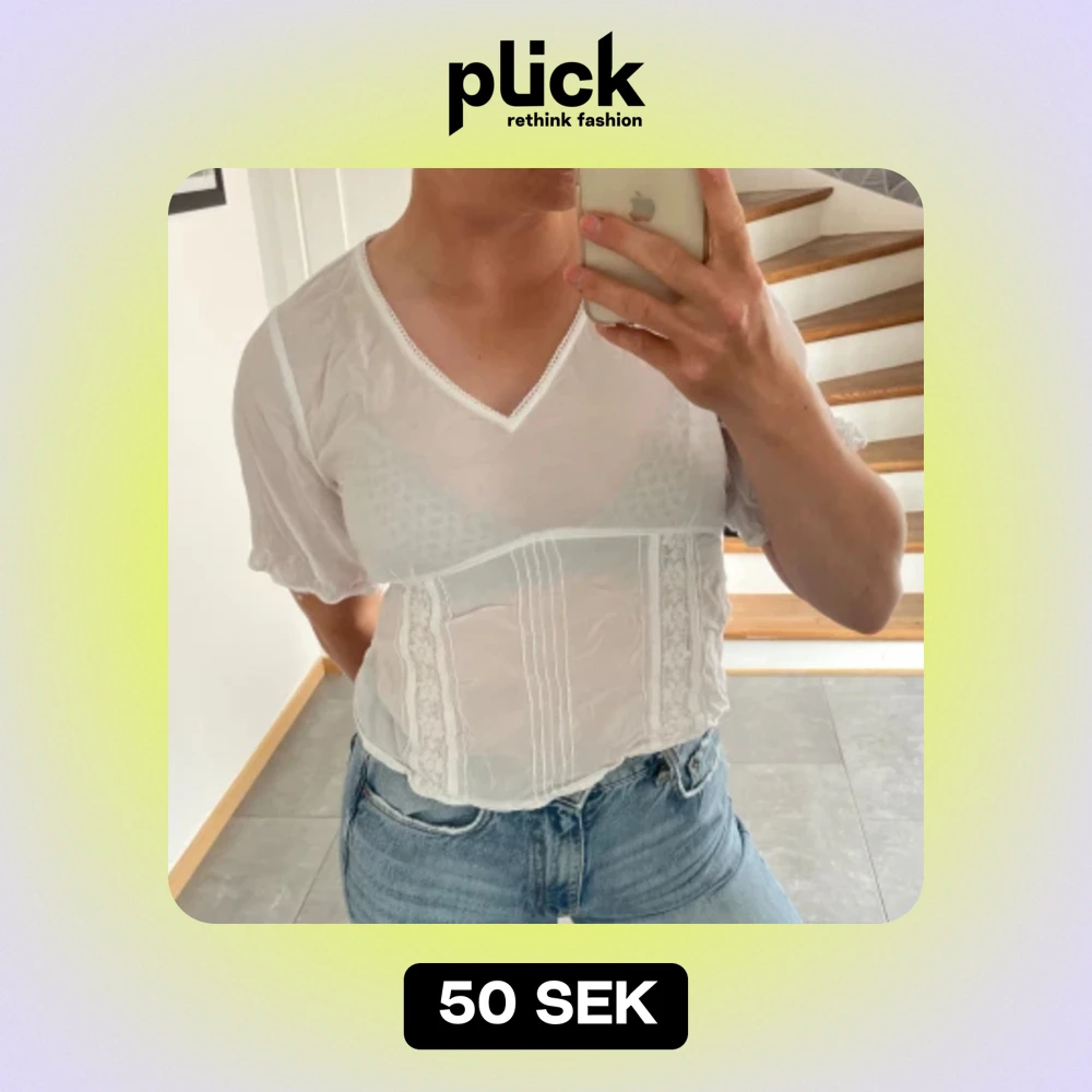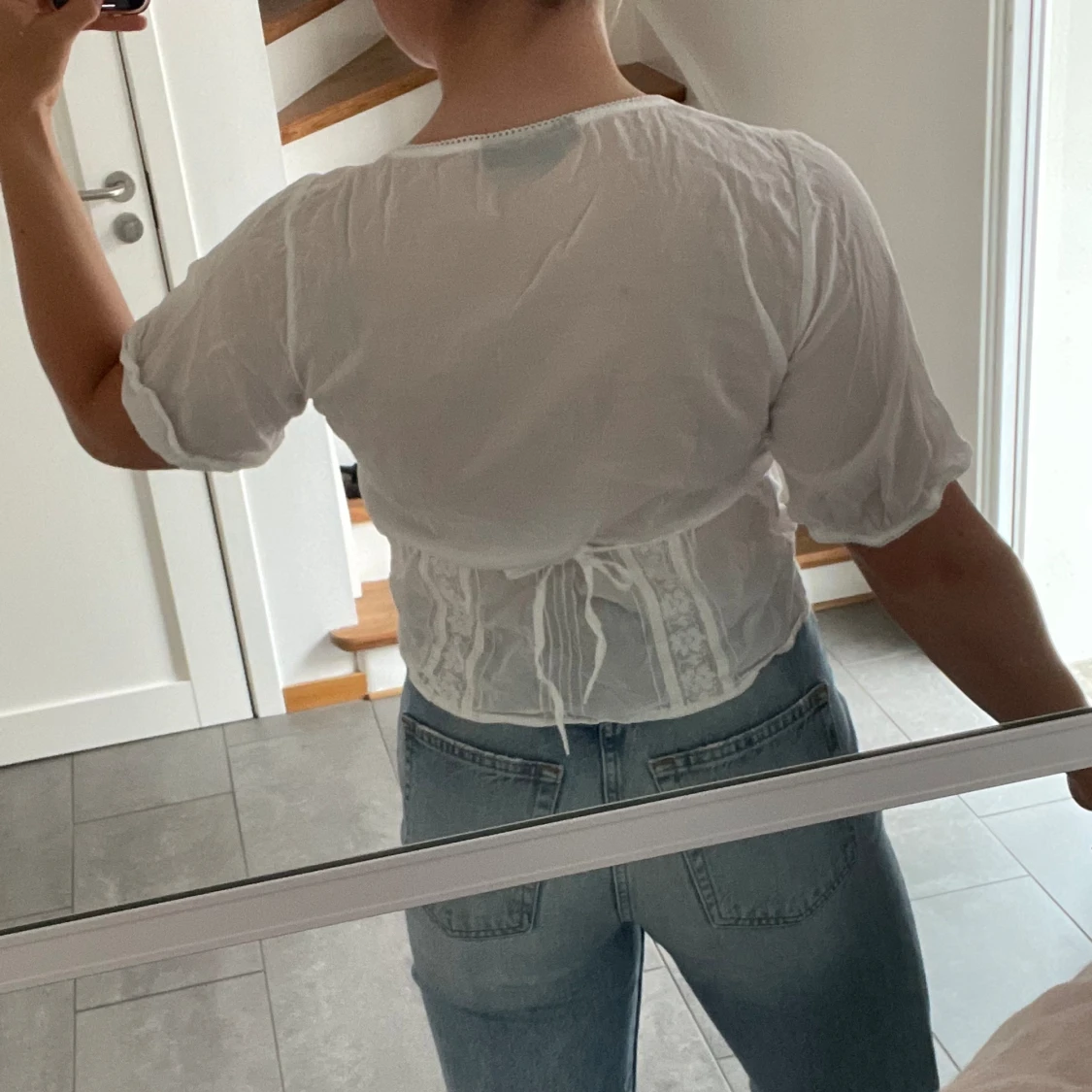Vit blus med blommiga detaljer, sömmar och band som går att knyta som man vill