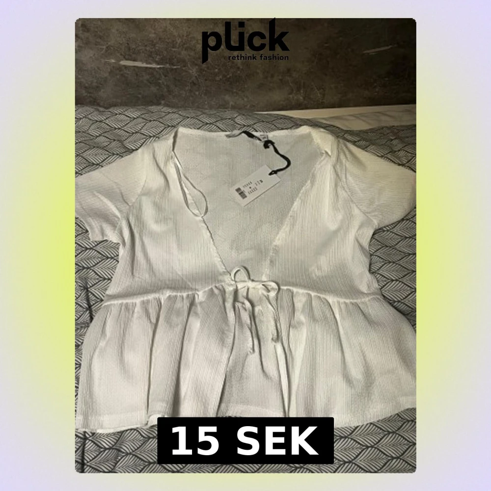 Supersöt vit omlottblus i storlek XS. Blusen har korta ärmar, v-ringad hals och knytband i midjan som ger en snygg siluett. Materialet är lätt och har en diskret ribbad struktur. Perfekt för dig som gillar en feminin och fräsch look.