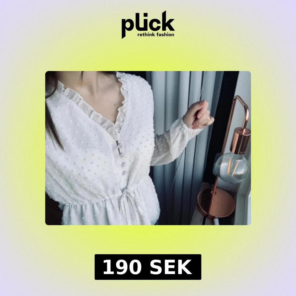 Supersöt vit blus från Shein med diskreta prickar i tyget, v-ringning och volangkant. Klänningen har knappar framtill, knyt i midjan och långa ärmar med lätt puff. Materialet är lätt och luftigt. Använd.