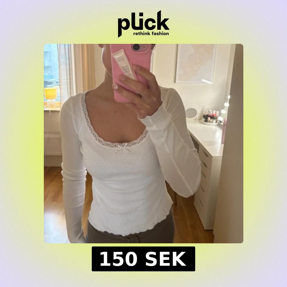 Säljer en stilren vit ribbad topp med långa ärmar och spetsdetaljer vid halsringningen. Toppen har en liten rosett framtill som ger en söt touch. Perfekt för en enkel och elegant look.