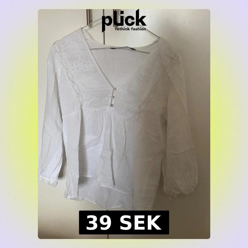 Säljer en vit blus från Zara i storlek XS. Blusen har v-ringning med dekorativa knappar, spetsdetaljer och broderier upptill.