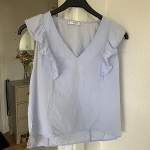 Jättefin ljusblå topp med volanger🩵 Använd fåtal gånger. Två små fläckar baktill, går säkert att få bort i tvätten!
