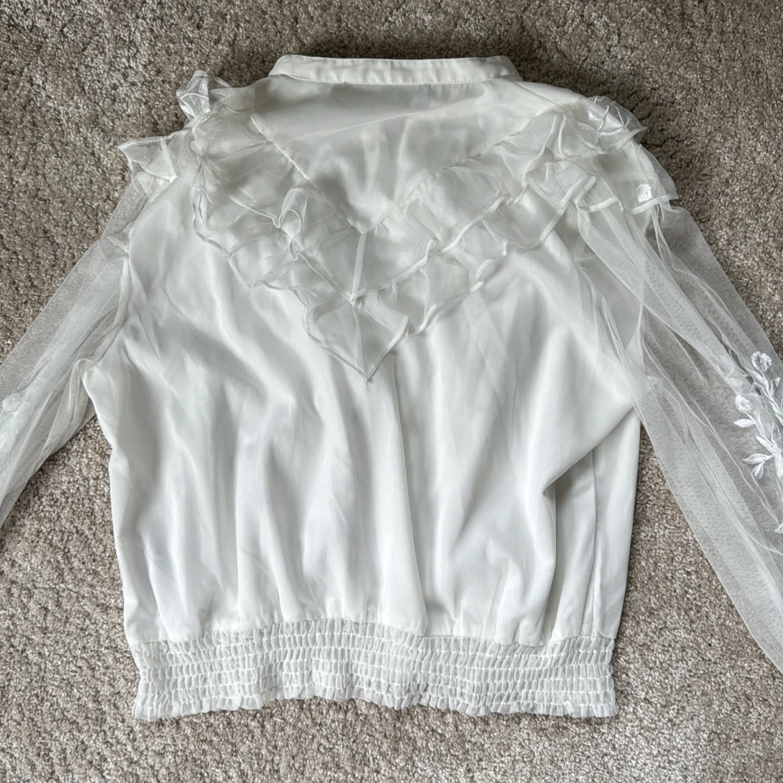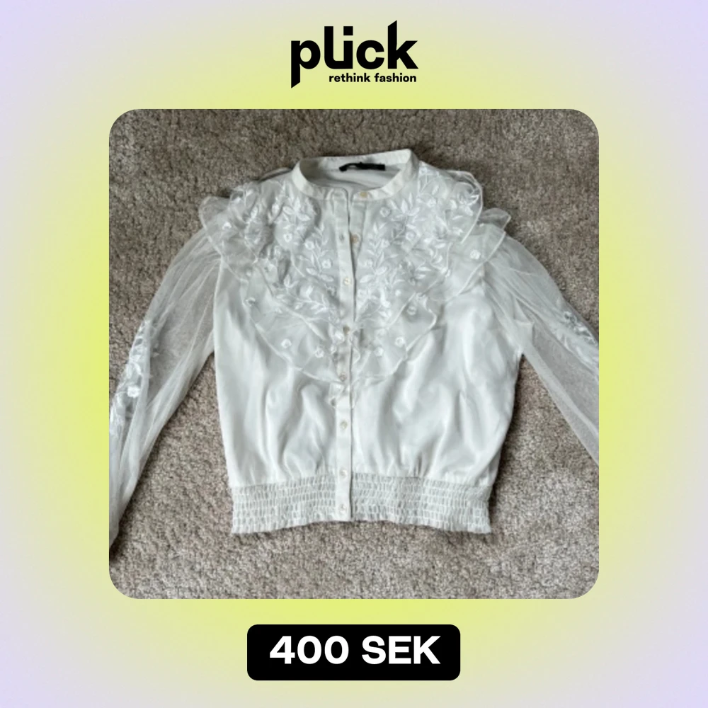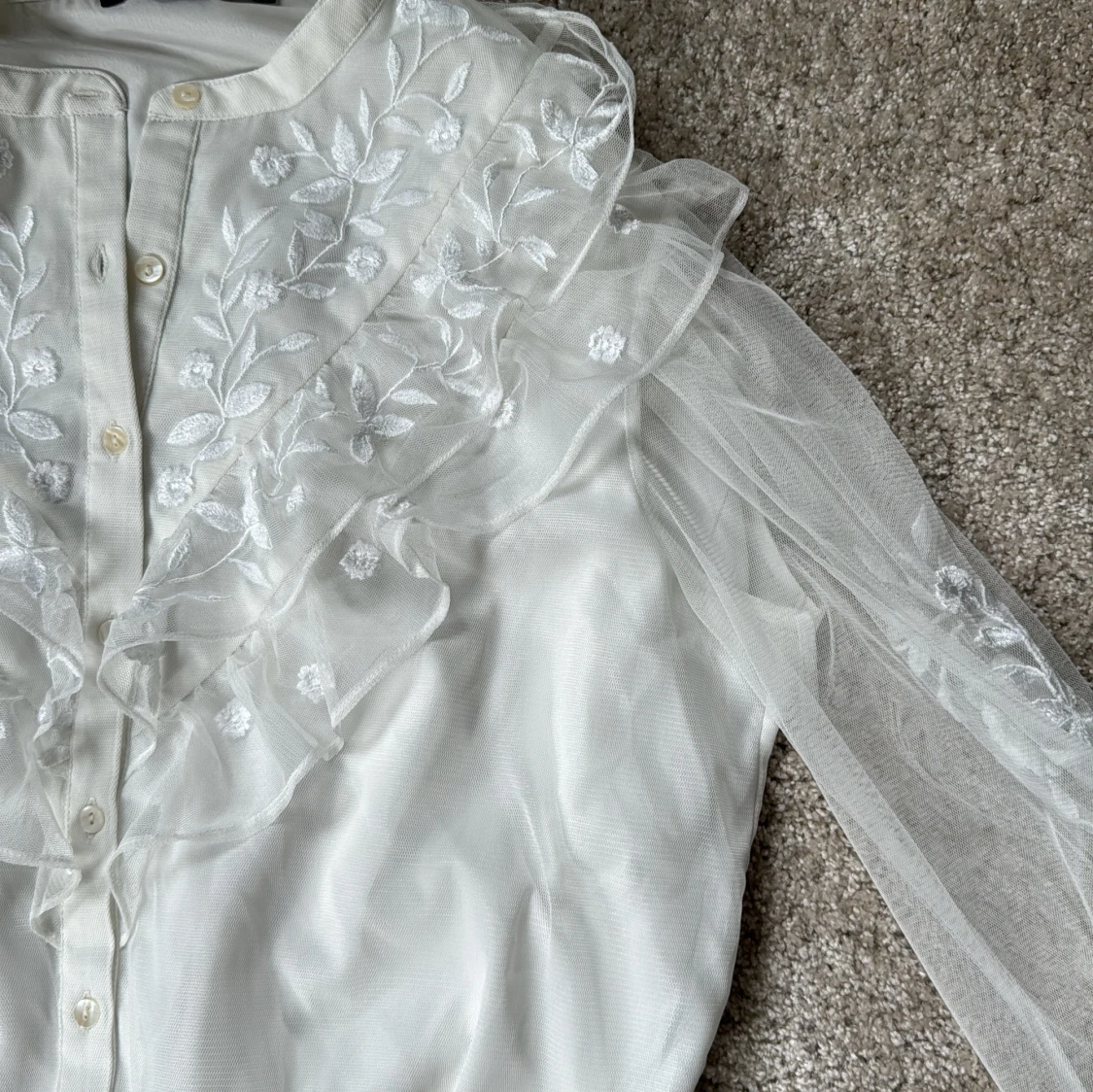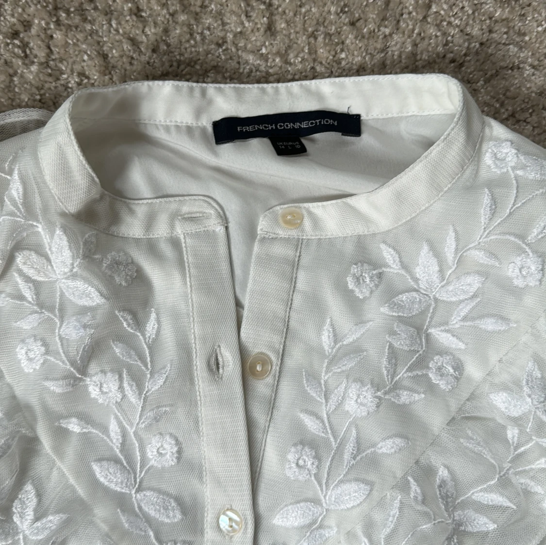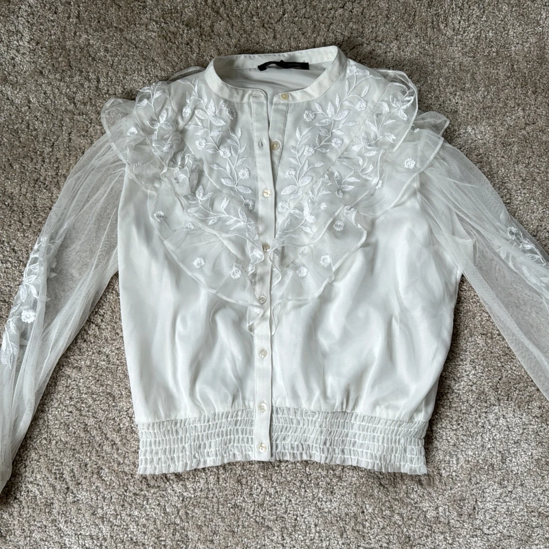 Jättefin, vit blus från French Connection i spetsmaterial med volanger. Genomskinliga ärmar.