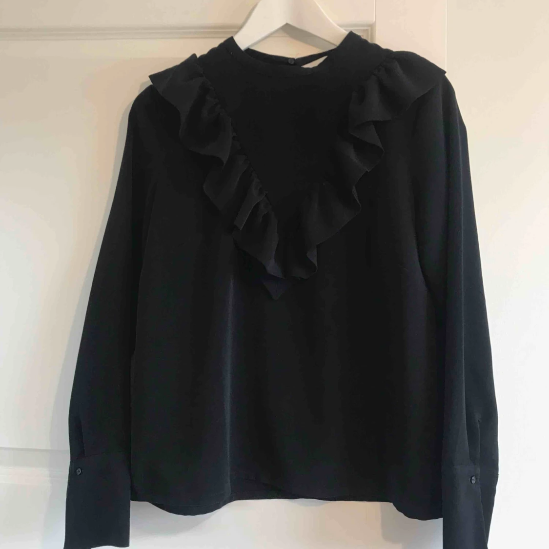 Storlek 38, Svart blus med volang från H&M, nyskick