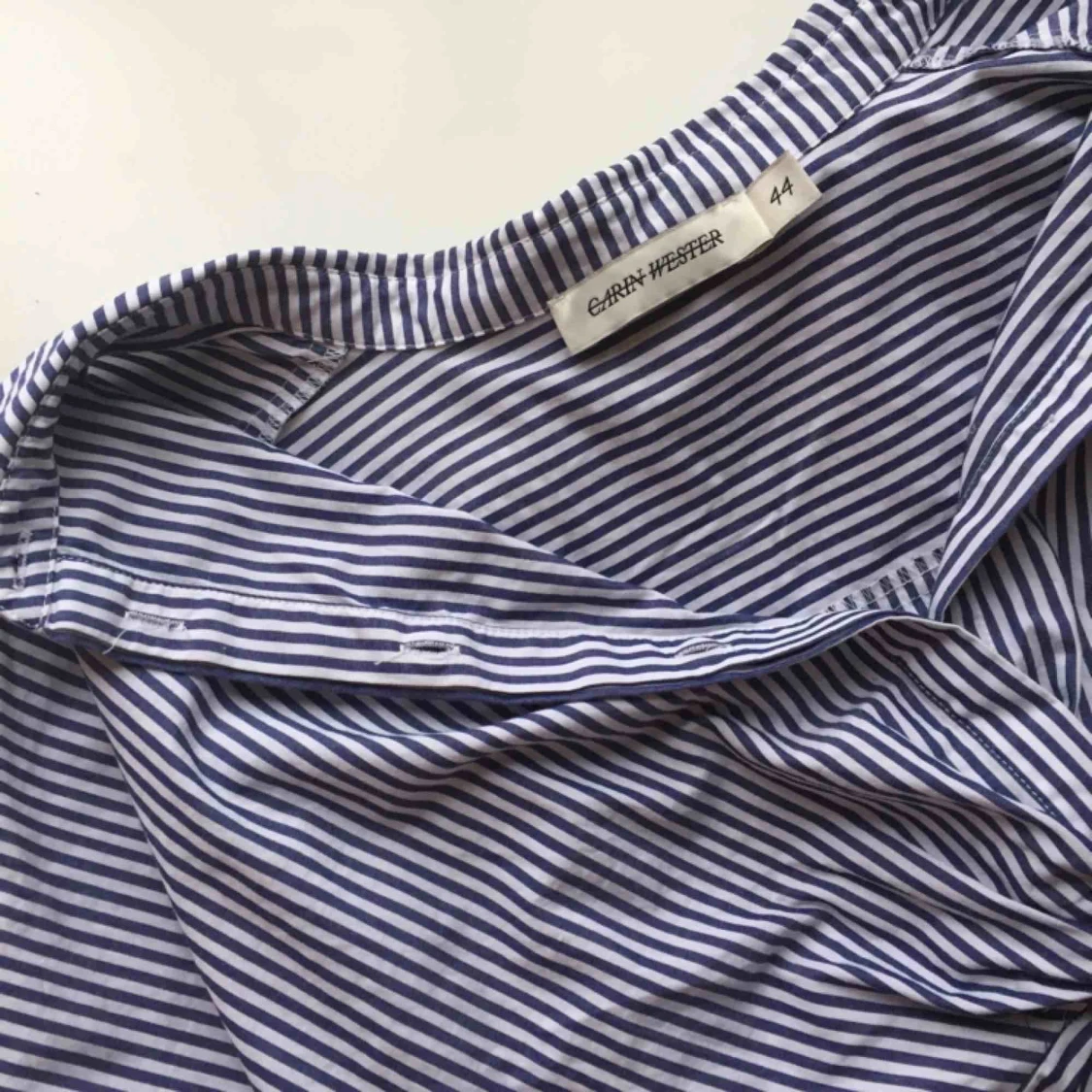 Blårandig, lite kortare skjorta med ”knytning” där fram. Passar M/L. Kostar 60kr inklusive frakt!
