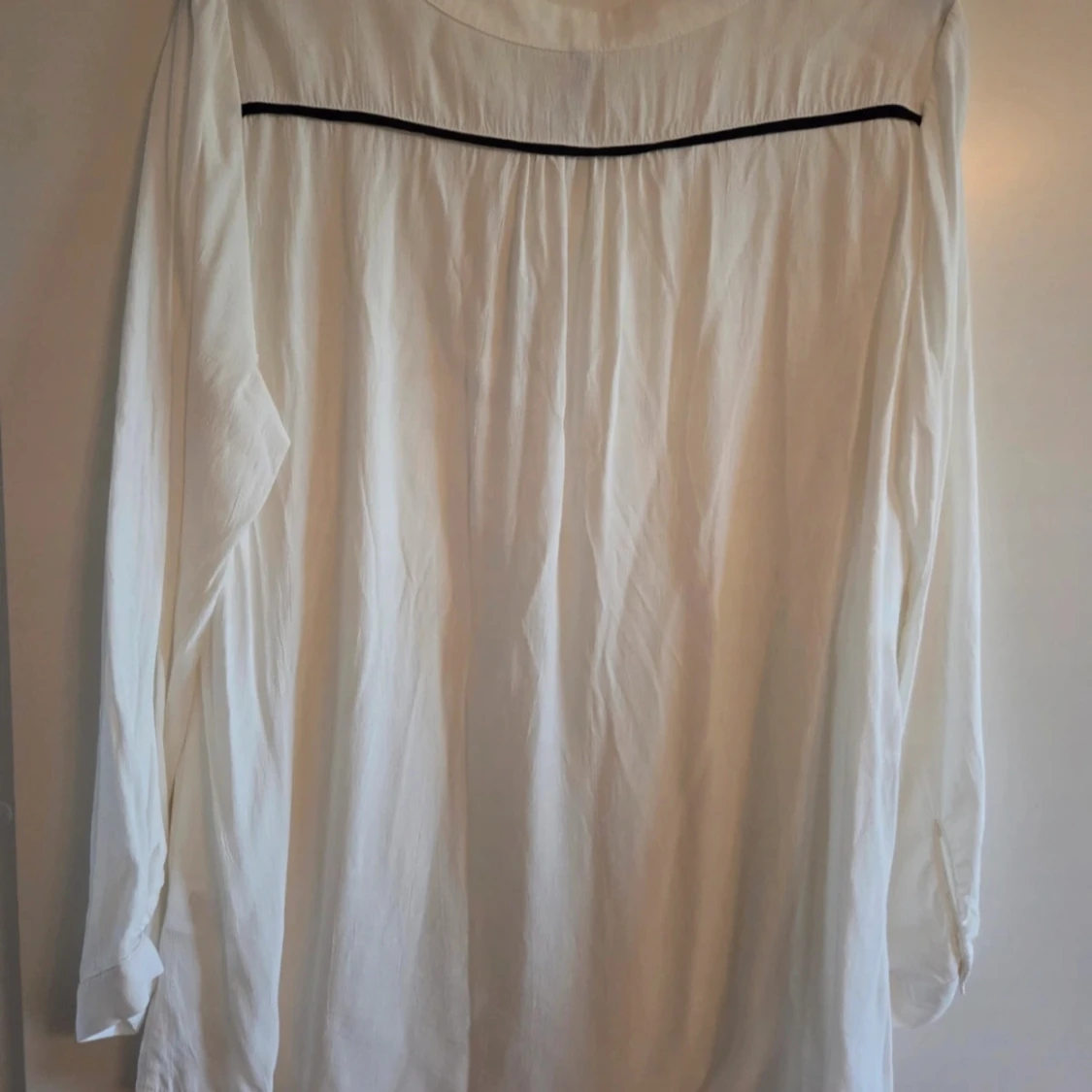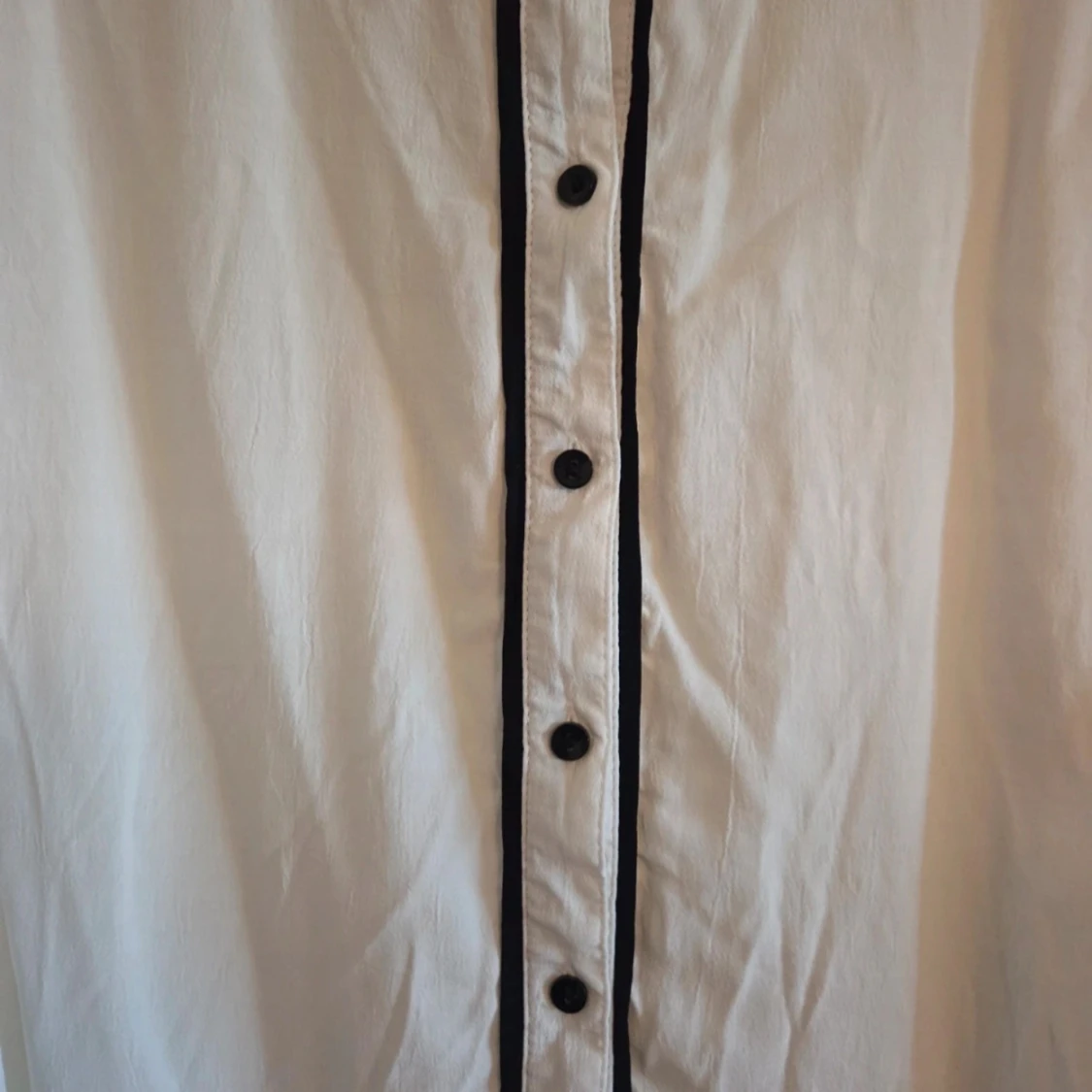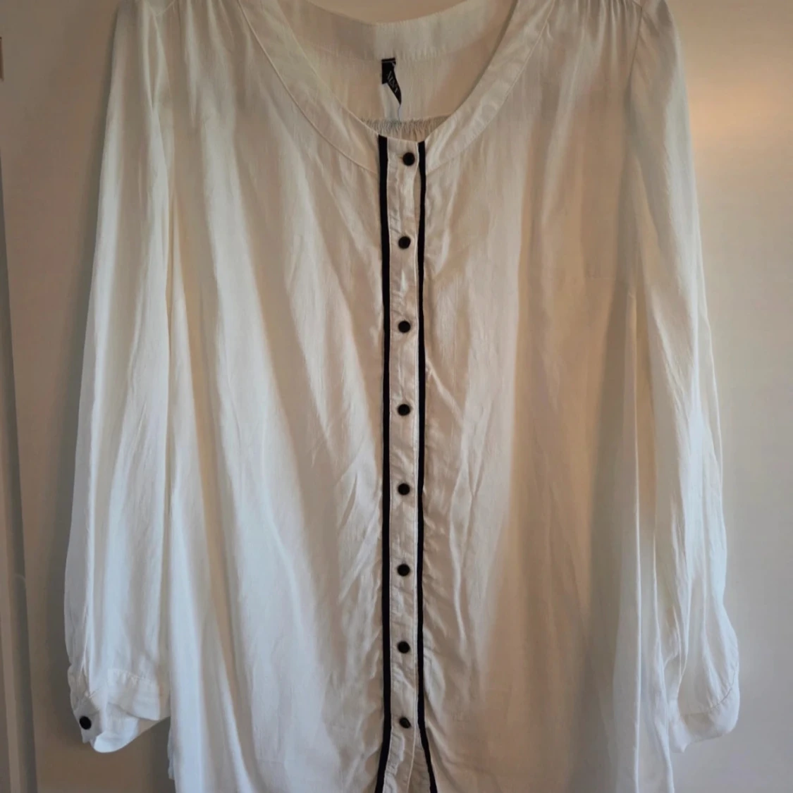 Vit långärmad skjorta från LYNX i storlek XL. Skjortan har svarta knappar och svarta detaljer längs knappslån och över ryggen. Lös passform och rundad halsringning. Perfekt för dig som gillar stilrena och enkla plagg med en twist.