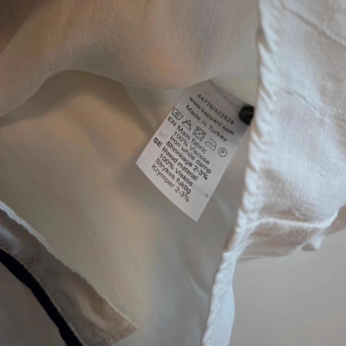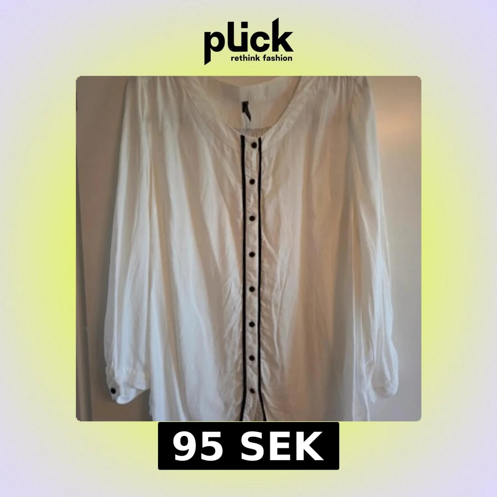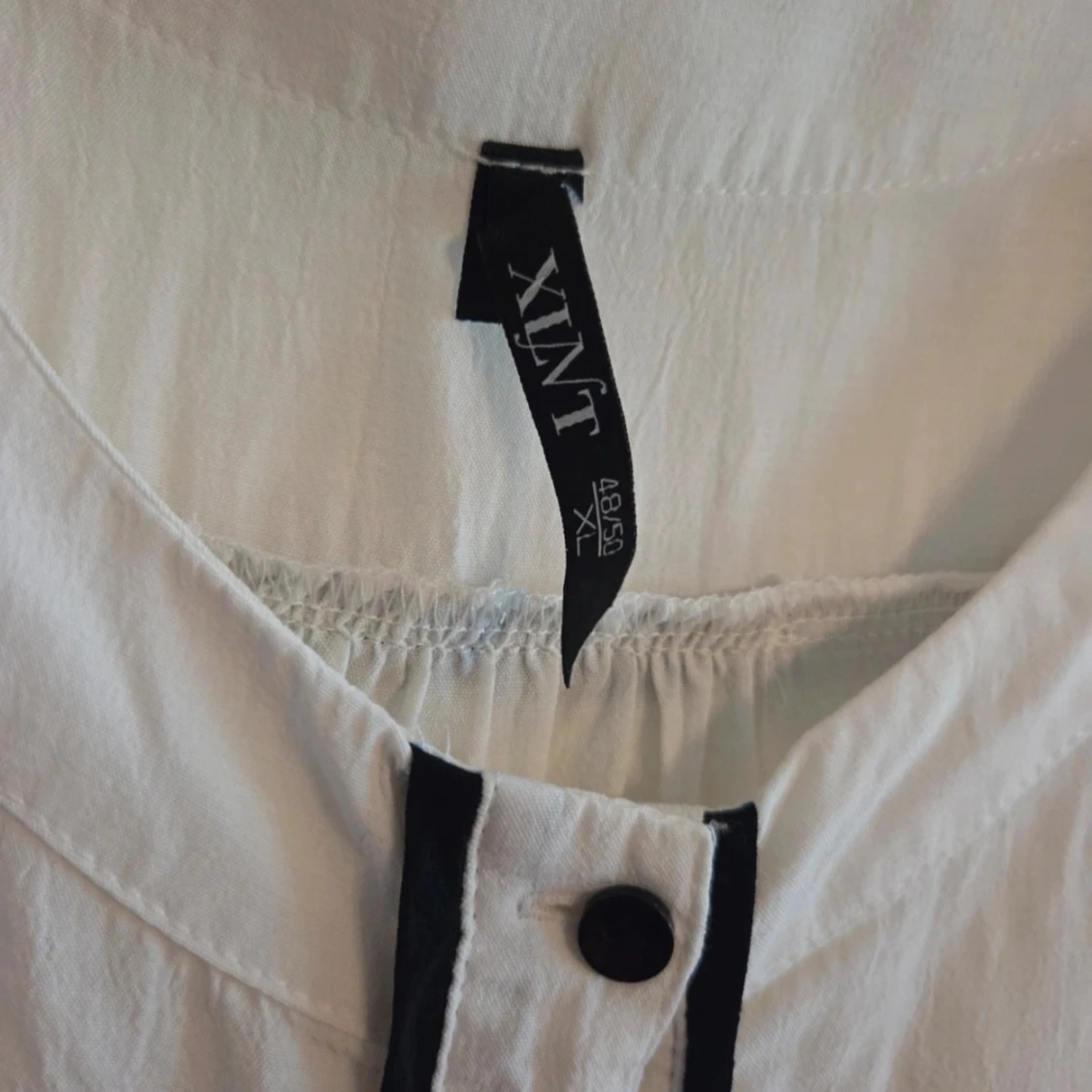 Vit långärmad skjorta från LYNX i storlek XL. Skjortan har svarta knappar och svarta detaljer längs knappslån och över ryggen. Lös passform och rundad halsringning. Perfekt för dig som gillar stilrena och enkla plagg med en twist.