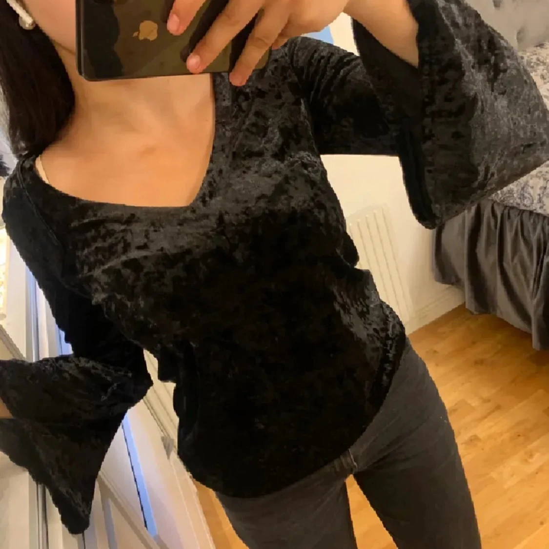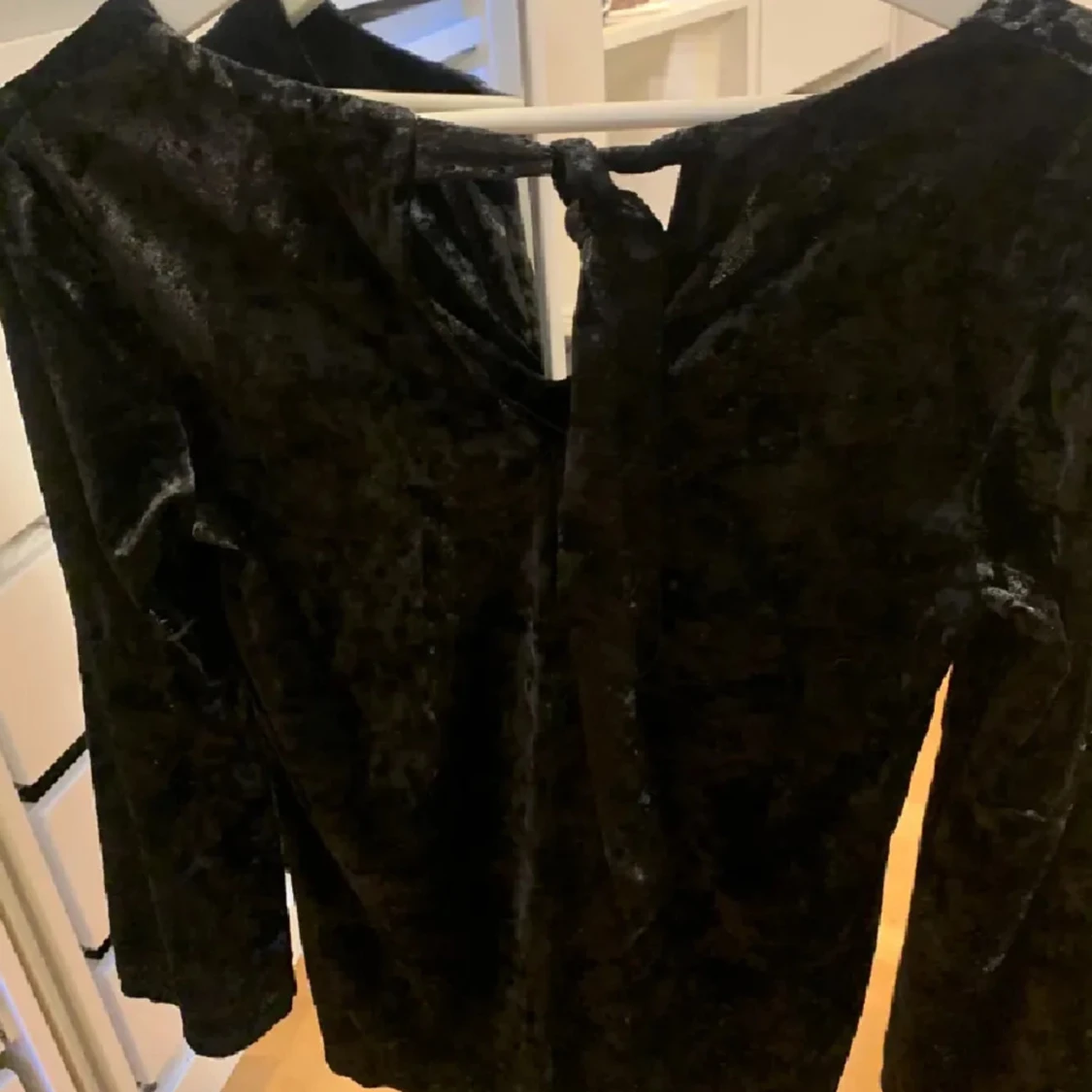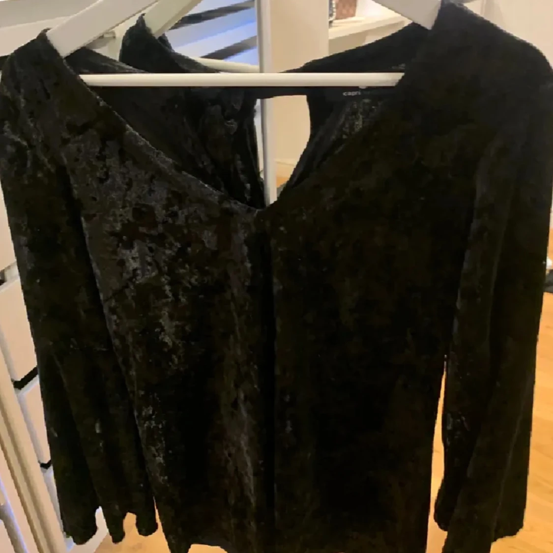 Säljer en svart sammetsblus med v-ringning och vida, utsvängda ärmar. Blusen har en snygg knytning i ryggen och är perfekt för dig som vill ha något lite extra. Materialet är mjukt och glansigt. Från Capri Collection storlek Xs.