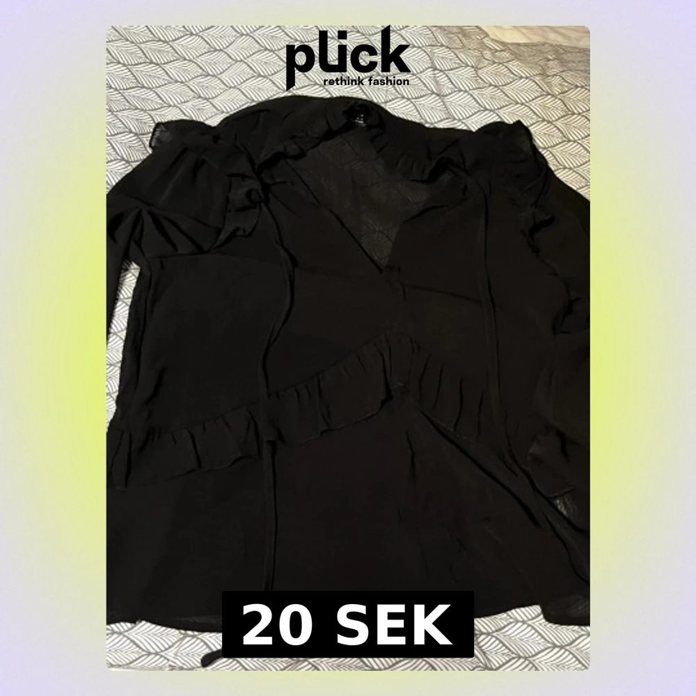 Svart blus från SHEIN i storlek XS med långa ärmar. Blusen har volangdetaljer längs axlar och framtill samt knytband vid halsen. Tunt, lätt material som ger en luftig känsla och snygg passform.