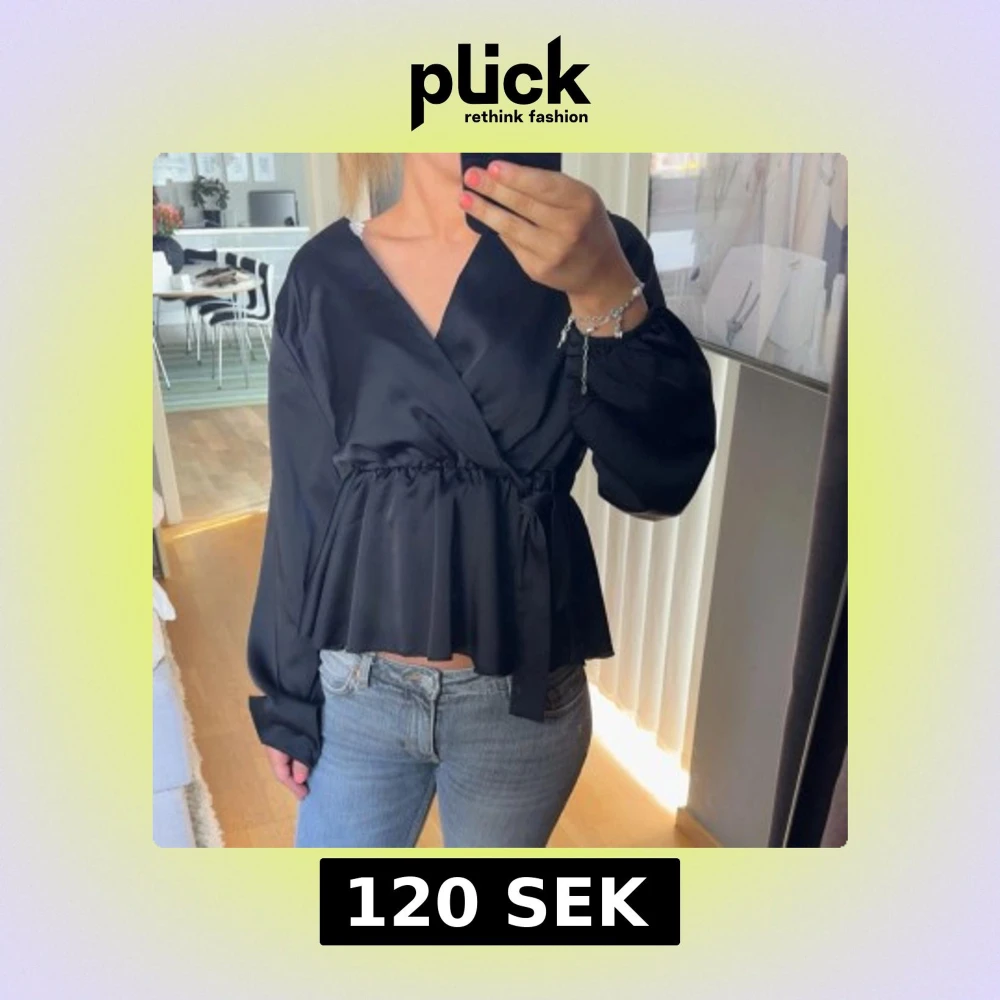 Snygg svart omlottblus med knytband i midjan och långa ärmar. Blusen har ett satin material, så snygg blus