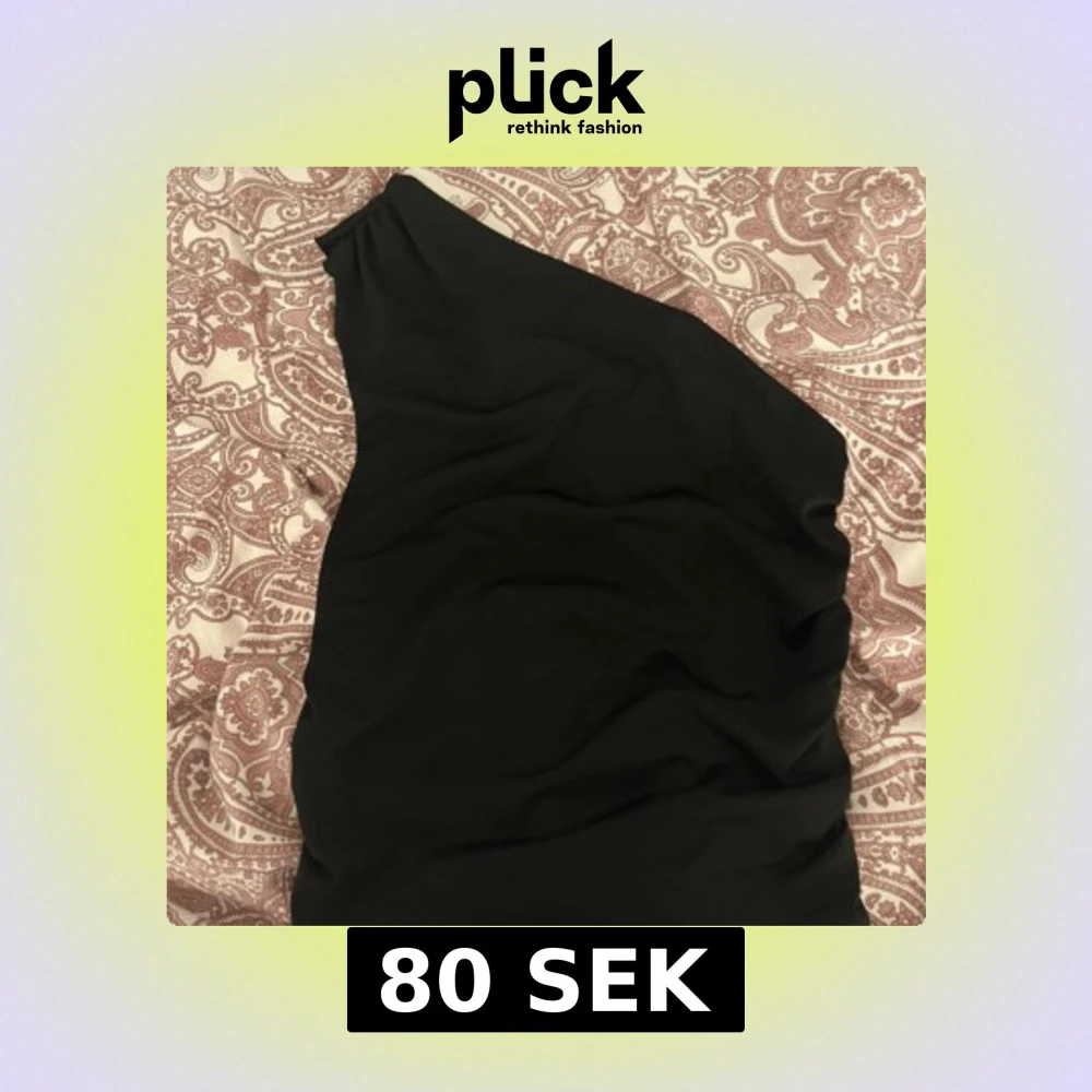 Säljer en svart topp med one shoulder-design. toppen har en stilren och enkel form som passar perfekt för dig som gillar minimalistisk stil. Materialet känns mjukt och följsamt mot kroppen.