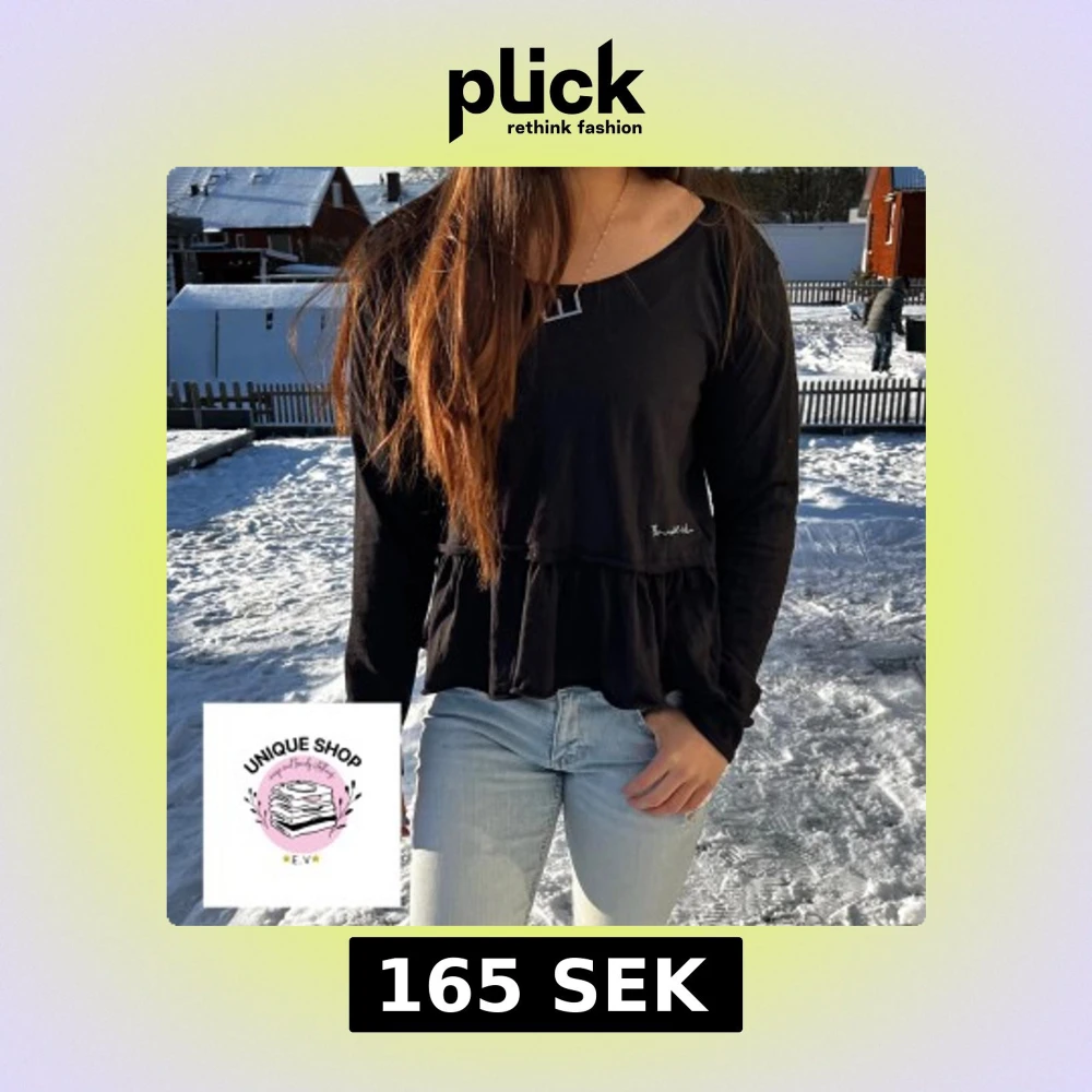Snygg svart långärmad topp med volangdetalj i nederkant. Perfekt för en stilren look med en twist. Toppen har en rund halsringning och är tillverkad i ett mjukt material. Wowsiii 🩵🩵
