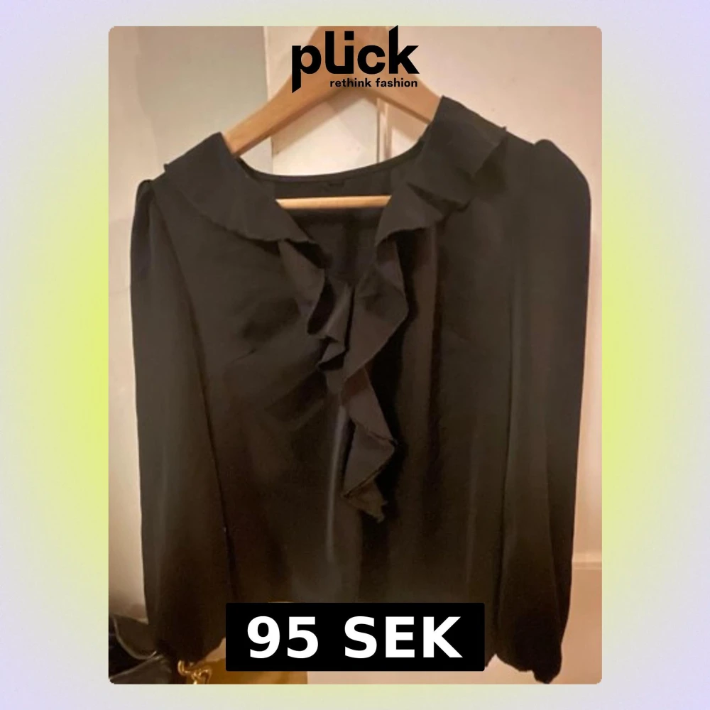 Fin svart blus med volanger framtill. Tröjan är i storlek XS men fungerar också i S. Säljer eftersom den inte kommer till användning hos mig! Den är helt oanvänd.