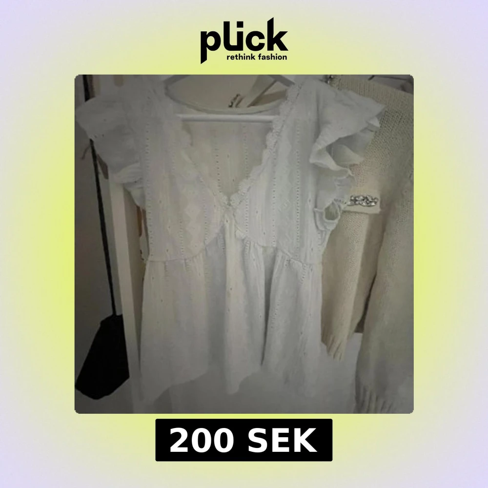 Söt vit blus med v-ringning, spetsdetaljer och volangärmar. Blusen har ett broderat mönster och är tillverkad i ett lätt bomullstyg. Perfekt för vår och sommar!