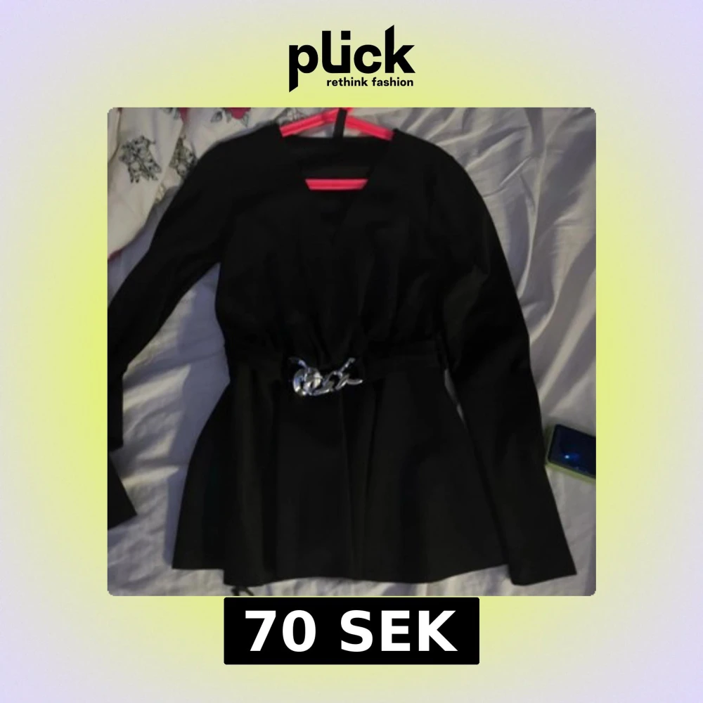 Snygg svart blus med v-ringning och lång ärm. Midjan markeras av ett bälte med en stor silverfärgad kedjedetalj som ger en cool touch. Perfekt för dig som vill sticka ut lite extra. Sitter snyggt och har en stilren look.