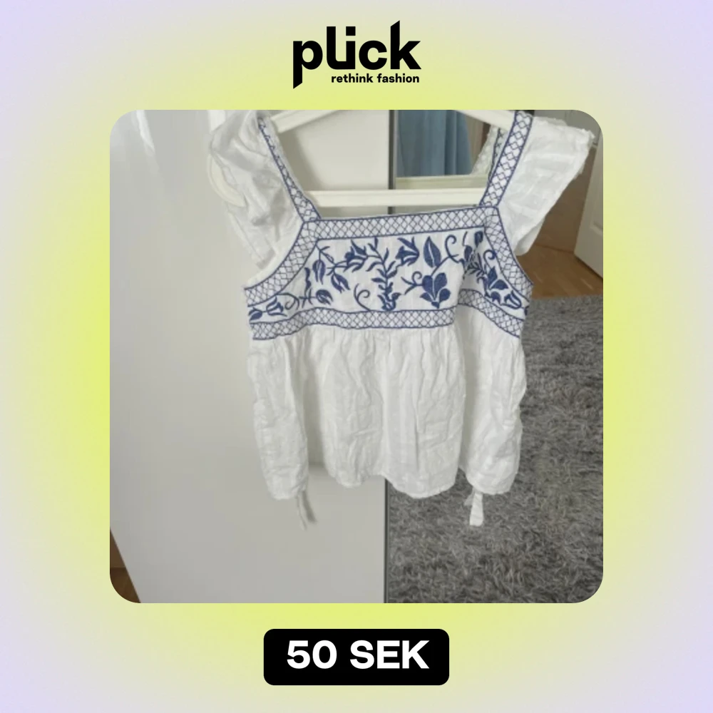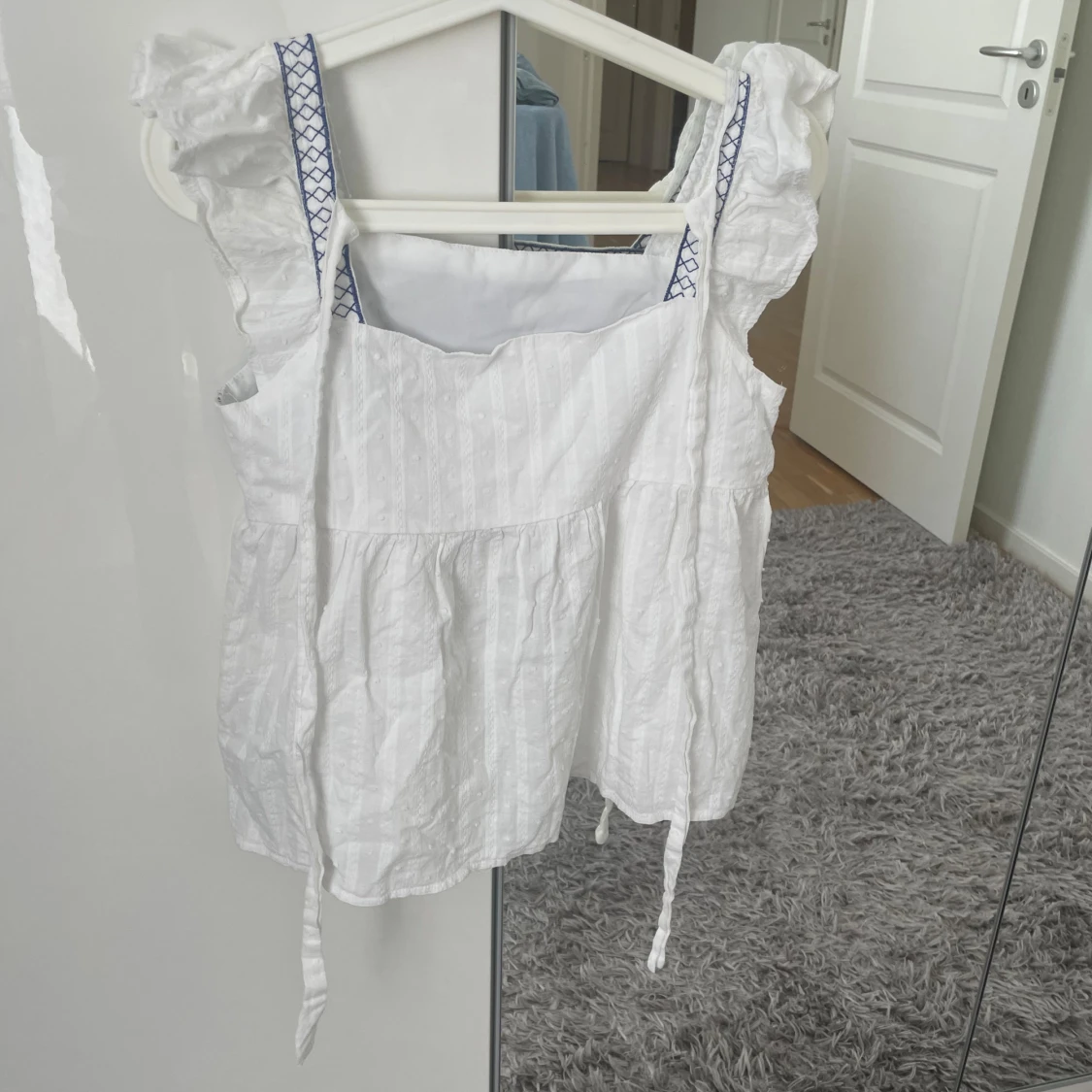 Vit blus med blå broderi på framsidan och på ärmarna.