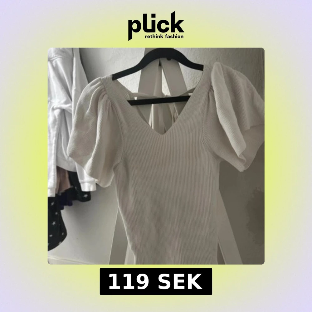 Supersöt vit ribbad klänning med puffiga korta ärmar och v-ringning både fram och bak. Klänningen har knytband i ryggen som ger en extra detalj. Perfekt för dig som gillar en feminin och trendig stil.