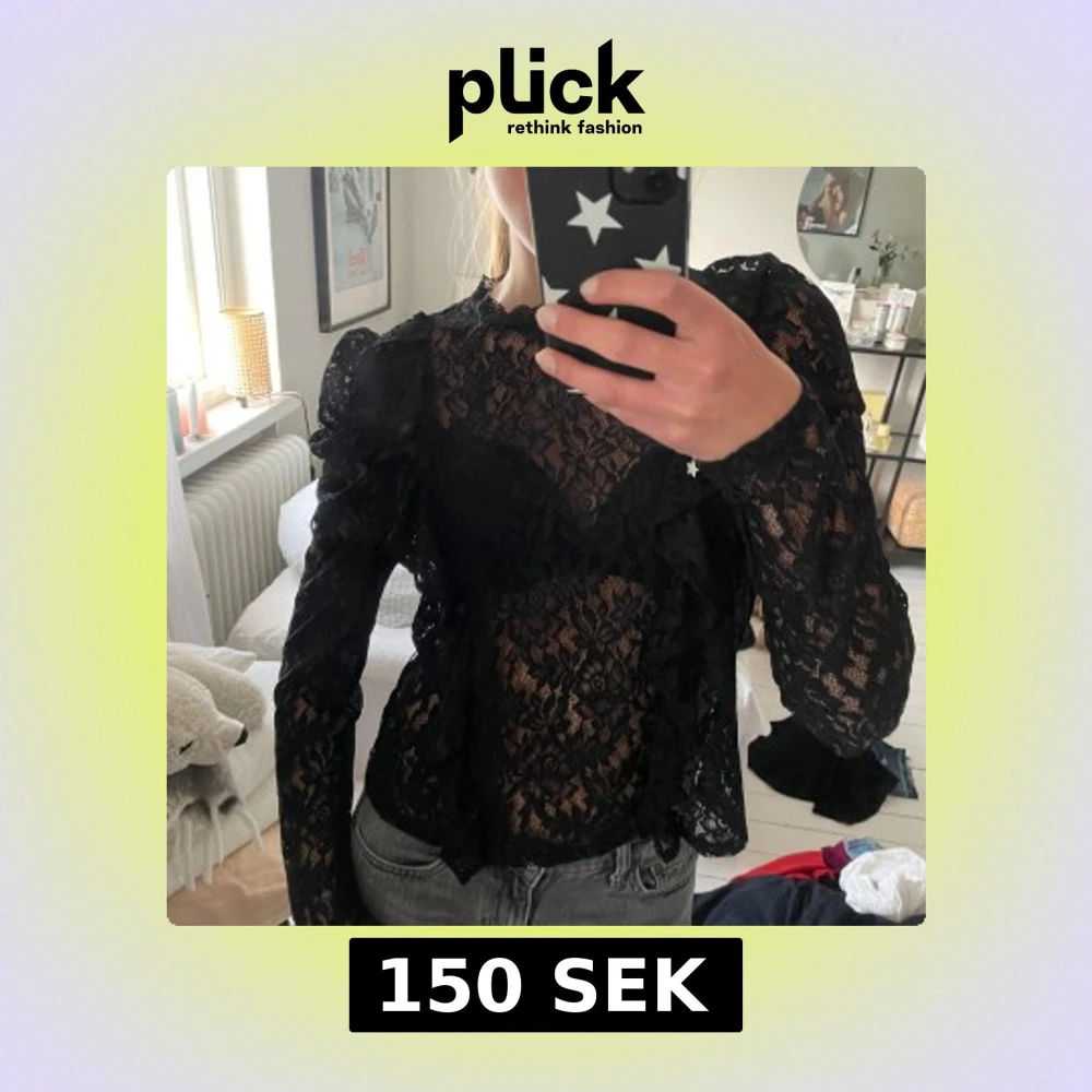 Säljer en svart långärmad blus i spets med blommigt mönster och volangdetaljer på axlar och framtill. Den är oanvänd men saknar lappar , skriv om fler bilder eller frågor.