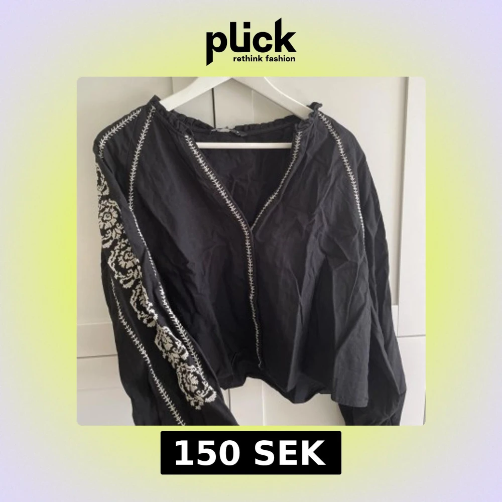 Svart blus från Zara med vita broderade detaljer längs ärmar och sömmar. Skrynklig för att den legat nerpackad. Står storlek L men passar även mig som har M. Använt men bra skick - inga defekter.