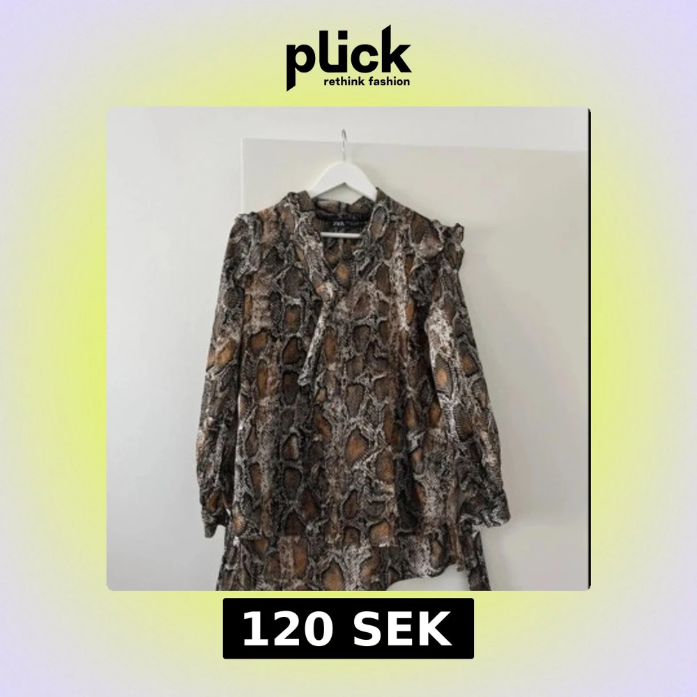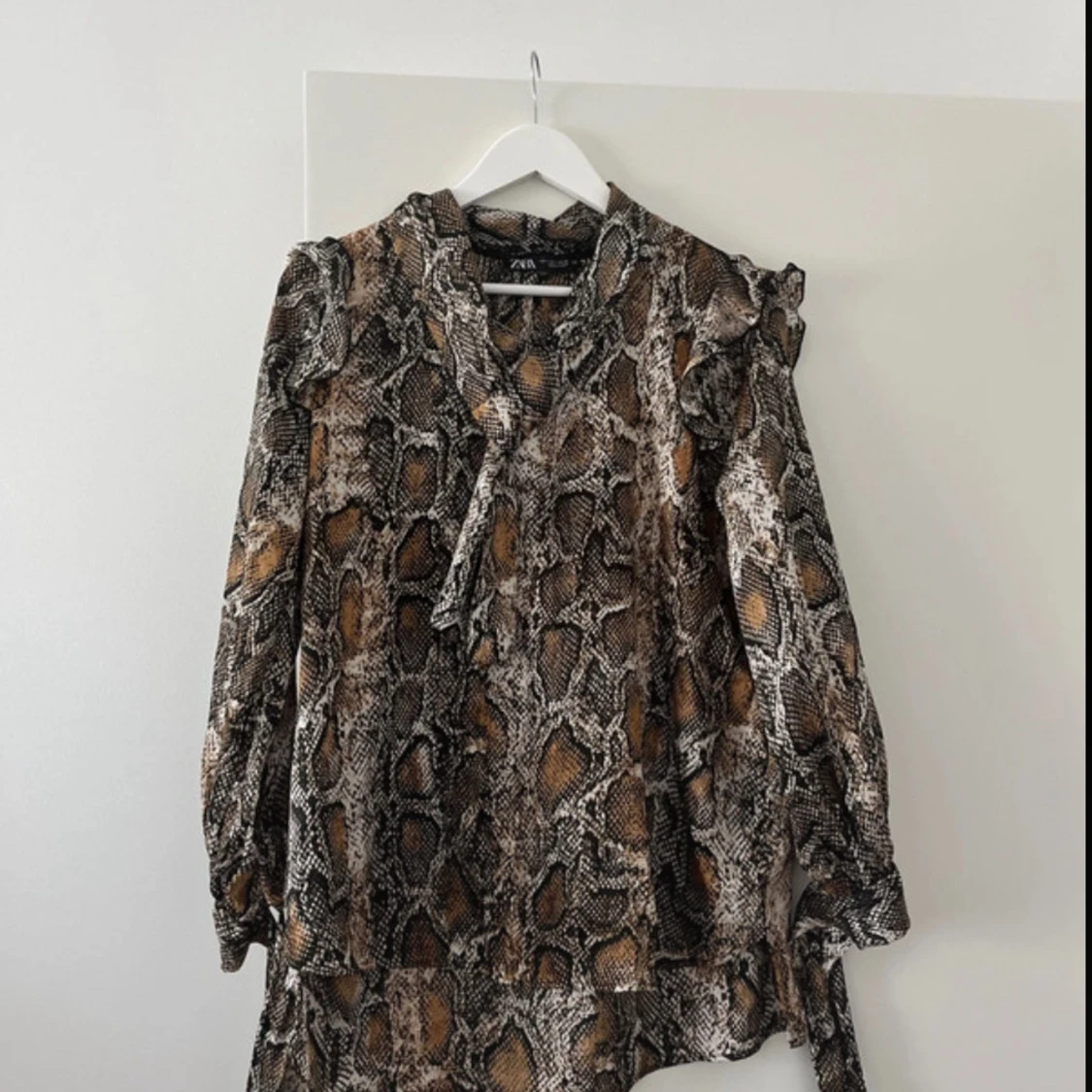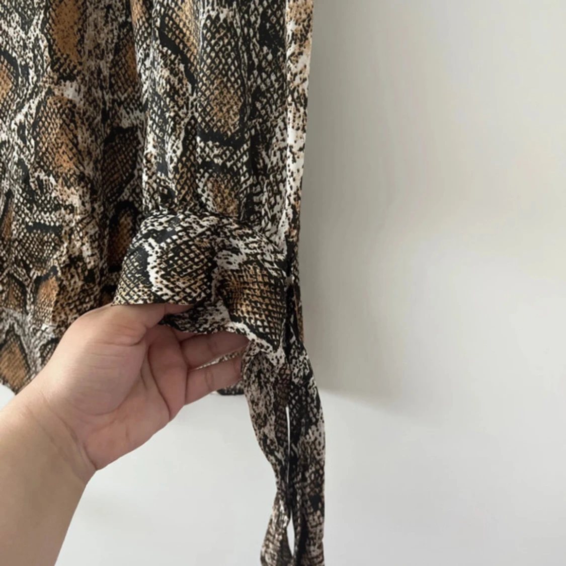 Snygg blus från Zara med trendigt ormmönster i bruna, svarta och beige toner. Blusen har långa ärmar, volangdetaljer vid axlarna och knytband vid halsen. Perfekt för dig som vill sticka ut med en edgy look.