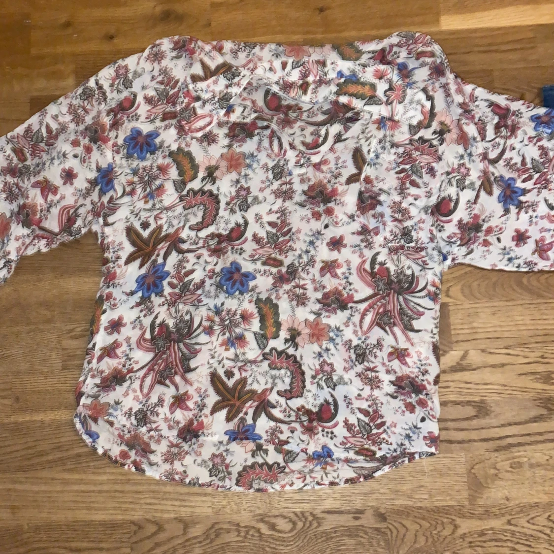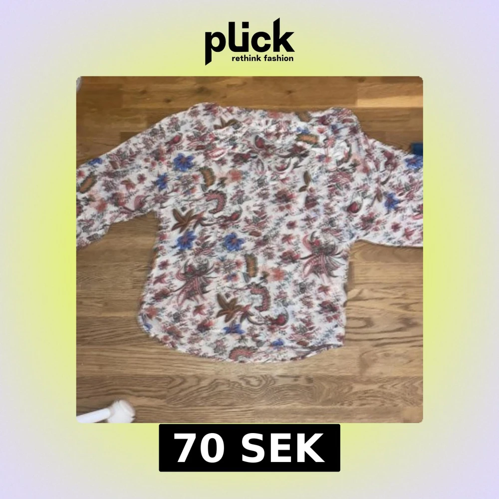 Säljer en luftig blus med blommigt mönster i rosa, blått och brunt. Skjortan har lång ärm och rundad nederkant, perfekt för en färgglad look. Passar dig som gillar bohemisk stil! Inga defekter. Använd köp nu knappen!