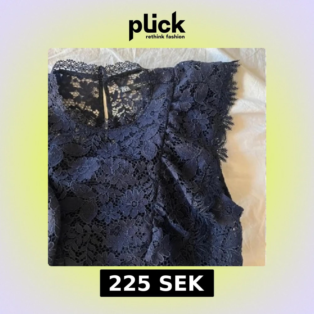 Snygg mörkblå spetsblus från Zara med blommigt mönster. Blusen är ärmlös och har en elegant design med volangdetaljer. Perfekt för att ge en stilfull touch till din outfit.