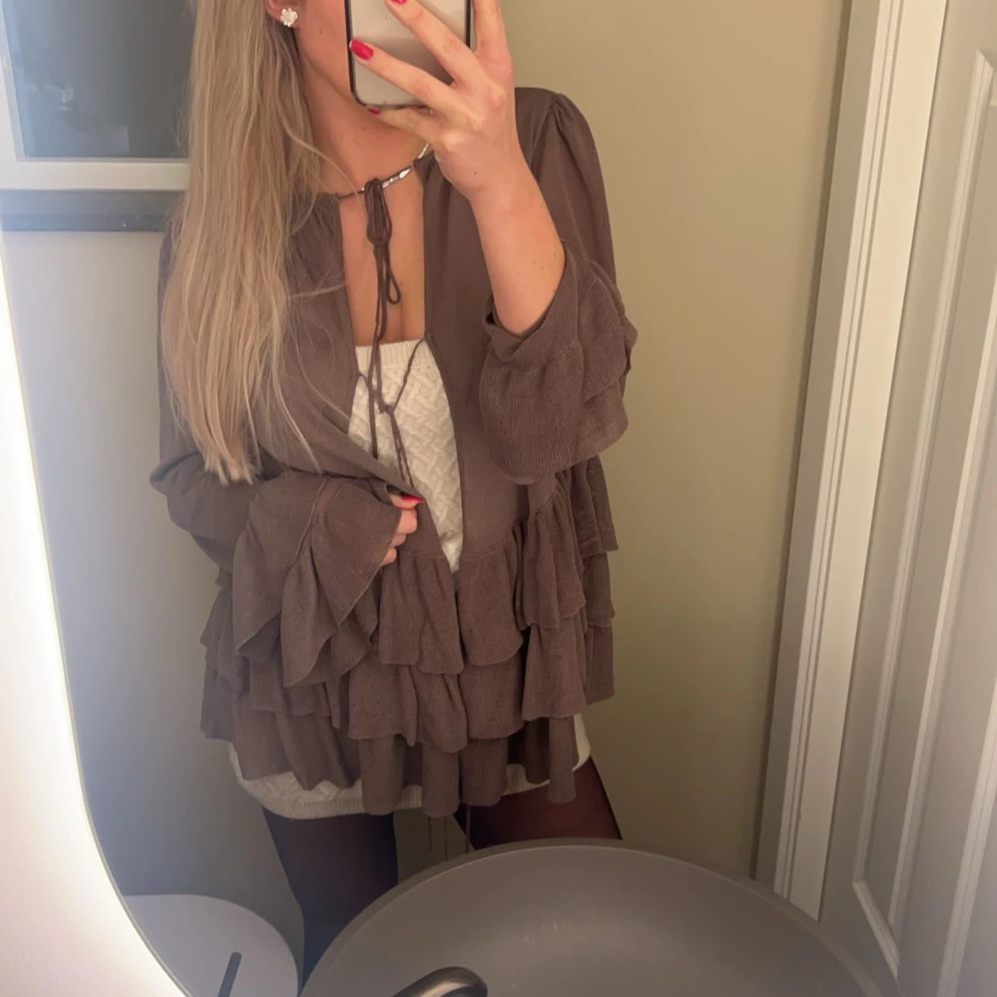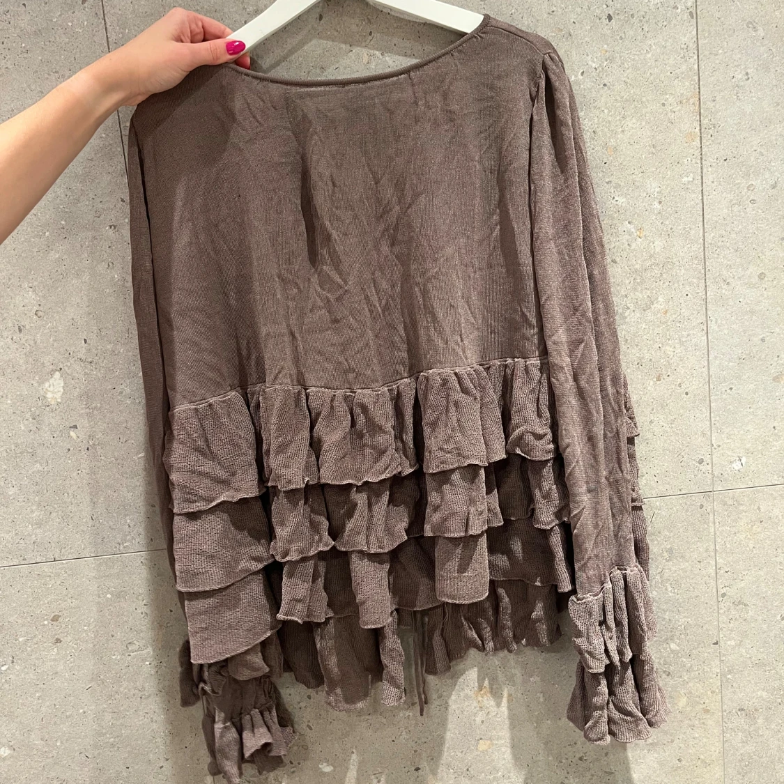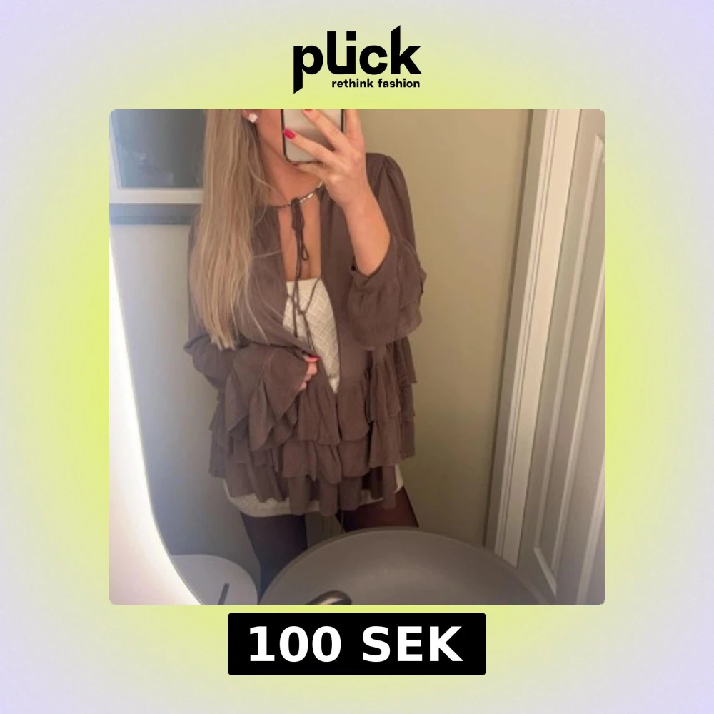 Brun tröja med volanger i lite syntetiskt material. Älskar älskar denna tröjan men råkade krympa lite i tvätten: den var en M men är nu en liten S/XS. Kan knytas i 3 snörningar på framsidan som man ser på bilden 🌟 vill man ha lite större passform så passar den en XS.