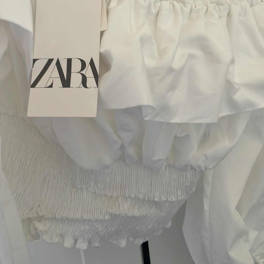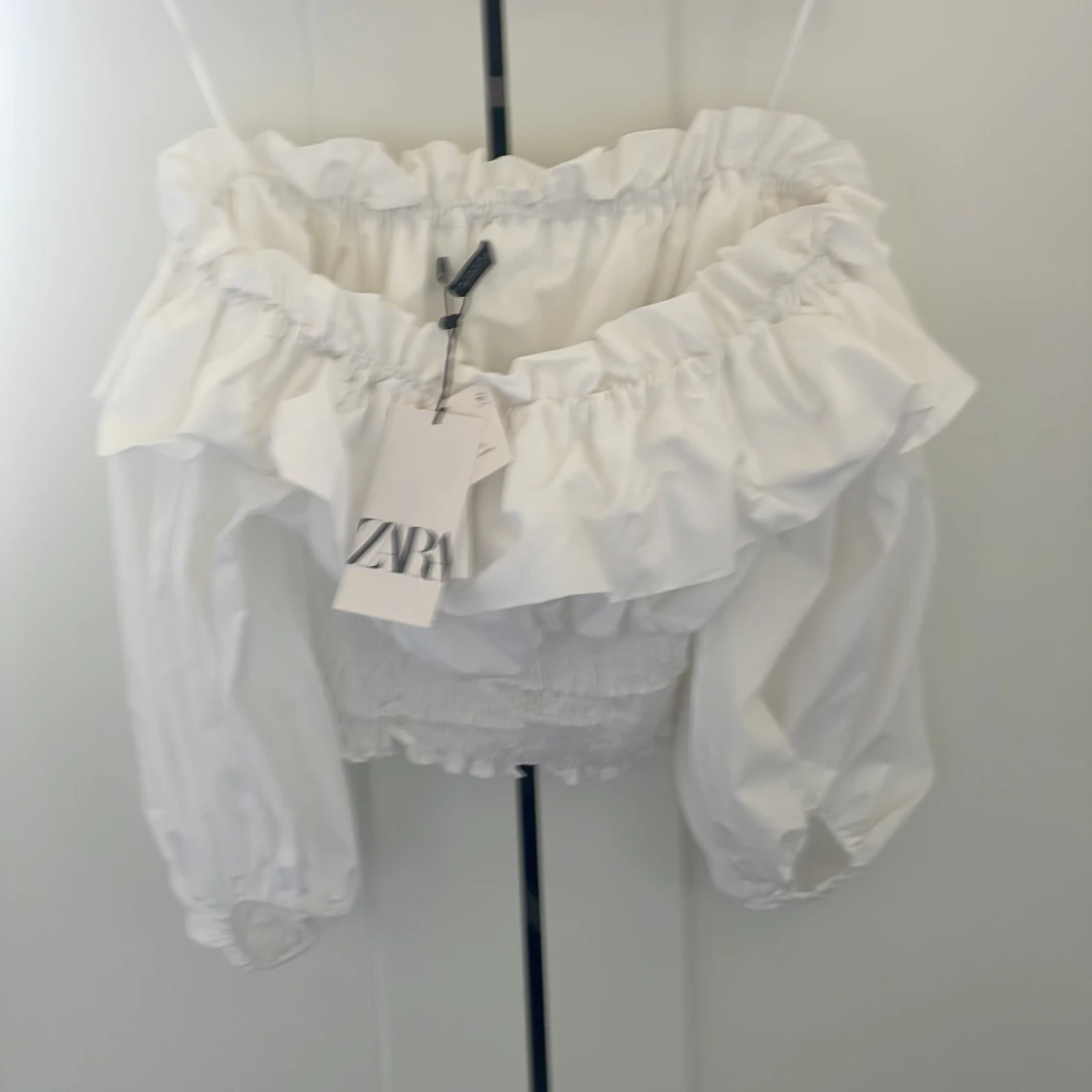 Vit blus från Zara med volang och puffarmar. Helt ny med prislapp.