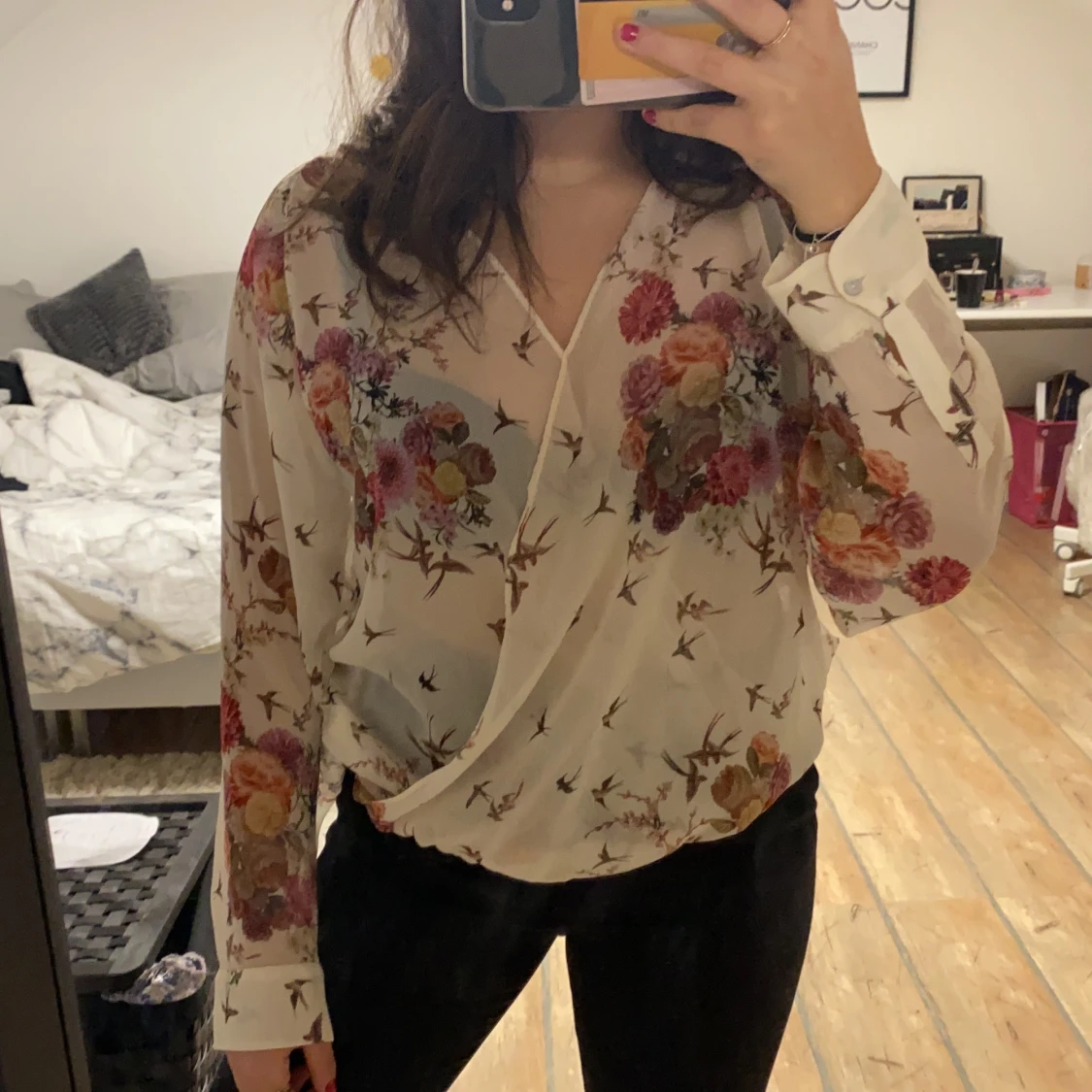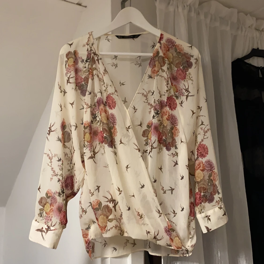 Krämvit blus från zara med blommönster i storlek S. Nästan aldrig använd och i bra skick. Frakt tillkommer💕💕