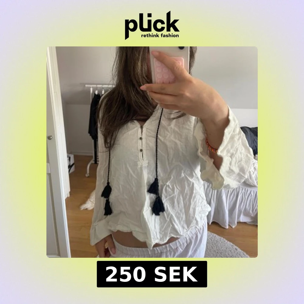 Säljer en luftig vit blus med långa ärmar, knappar framtill och svarta tofsar som detalj. Blusen har en avslappnad passform och är perfekt för vår och sommar. Superfin att styla till både jeans och kjol! Strl: s/m