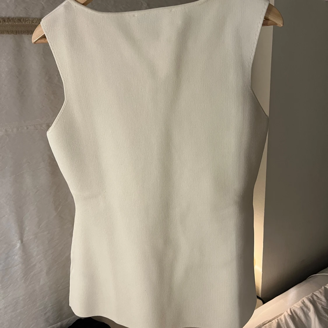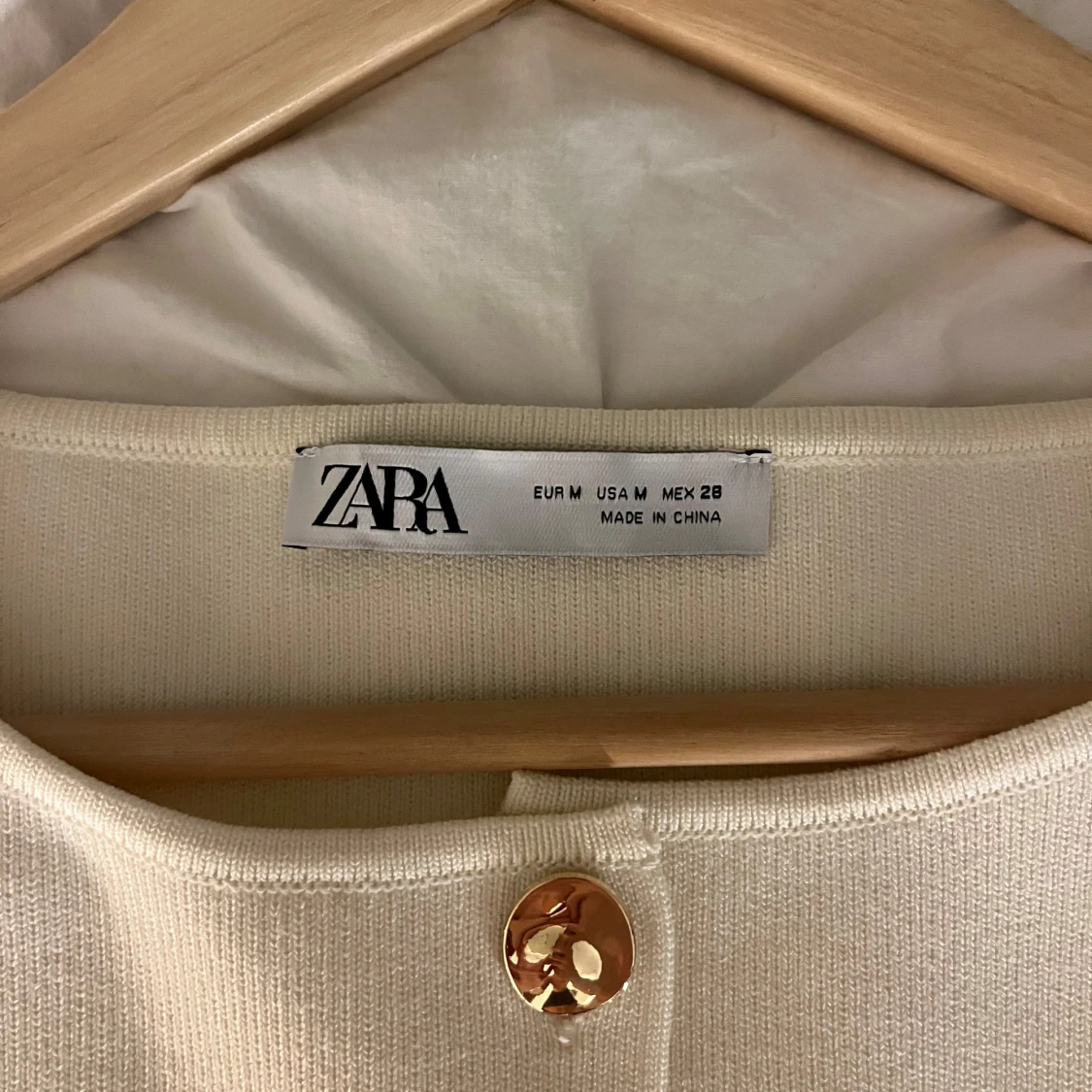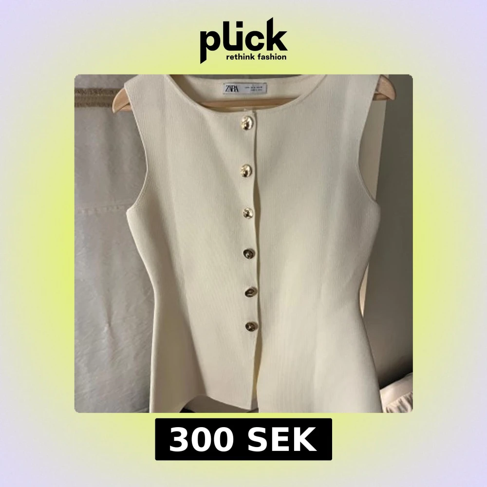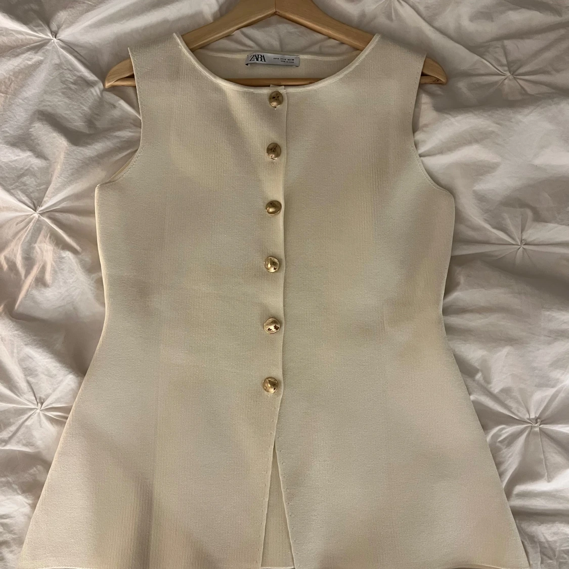 Snygg vit väst från Zara med eleganta guldknappar framtill. Västen har en stilren design och är ärmlös, vilket gör den perfekt för lager-på-lager. Passar bra till både vardag och festliga tillfällen.