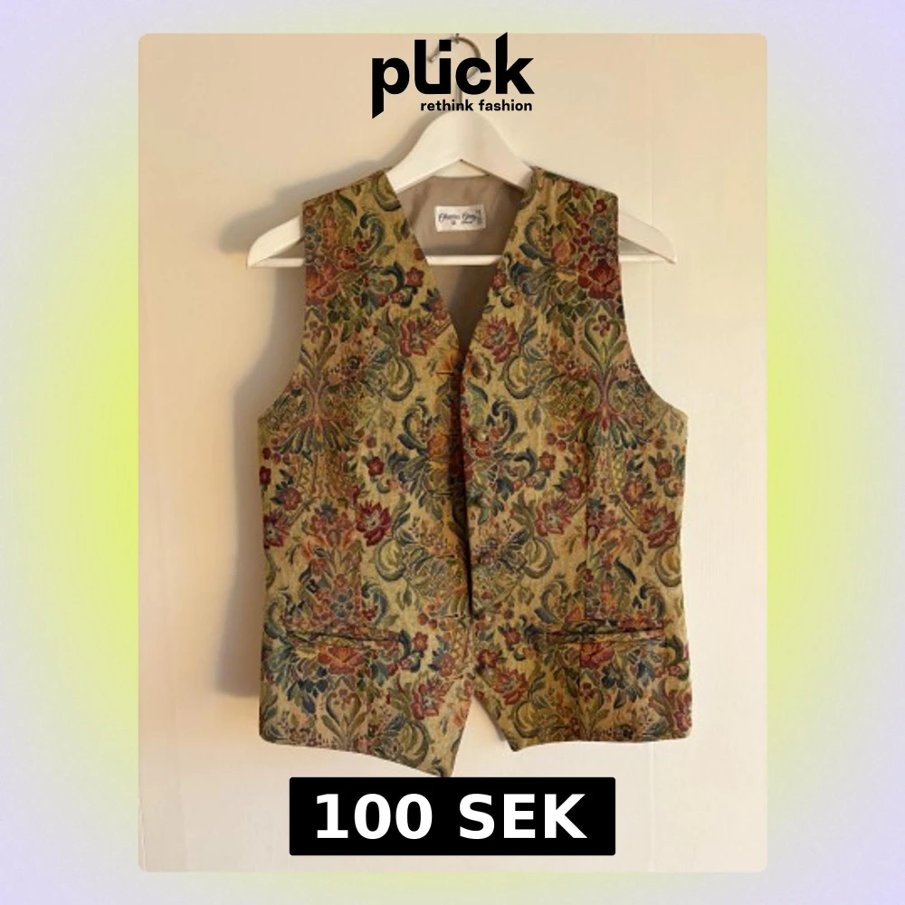 Unik väst från Charles Gray London med brokigt blommönster i beige, grön, röd och blå. Västen har klädda knappar framtill, två fickor och är helfodrad i beige tyg. Perfekt för dig som vill sticka ut med vintagevibbar och coola detaljer.