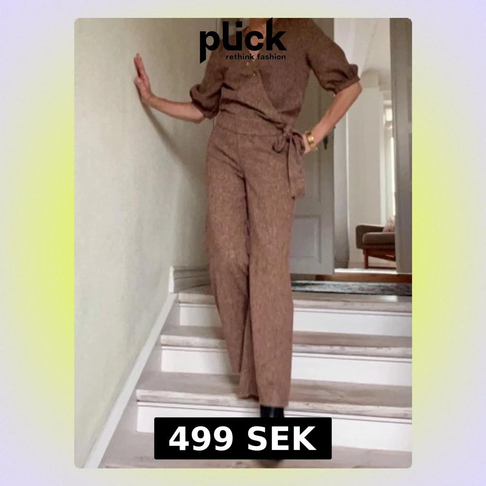 Snygg tvådelad kostymdress med struktur i tyget, brun färg med diskreta rutlinjer i rosa ton. Omlottopp med v-ringning, lätt puffärm och knyt i sidan vid midjan, vida byxor med hög midja och snyggt fall. För en klassisk stil med twist. Obs. Säkerhetsnål som håller ihop blusen fram samt sjal på sista bilden ingår ej i köpet. Varieras snyggt med egen brosch eller osynlig säkerhetsnål. Modellen på bilden är strl 36, plaggen är strl 34 men passform lite större.
