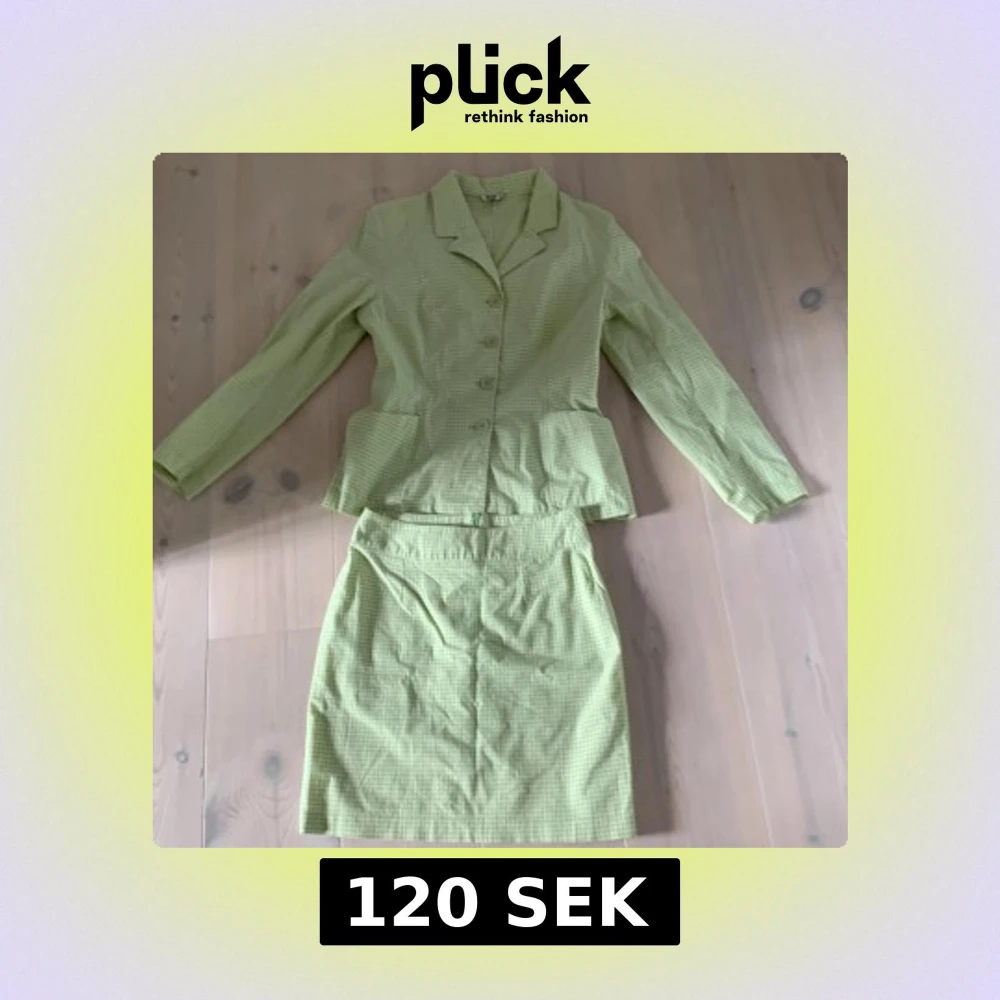Snyggt tvådelat set från Flash med kavaj och kjol i ljusgrönt rutigt mönster. Kavajen har klassisk krage, knappar framtill och markerad midja. Kjolen är rak och höftlång. Perfekt för dig som gillar retrovibbar och pastelliga färger.