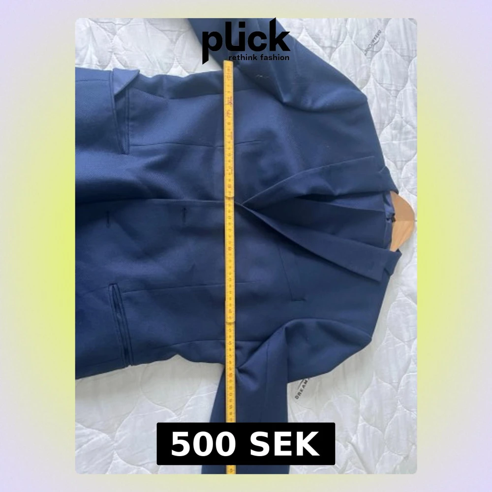 Säljer en mörkblå kavaj med klassisk krage och två fickor framtill. Kavajen har en stilren look och är tillverkad i ett slätt tyg som känns lite strukturerat. Perfekt för dig som vill ha en clean och tidlös stil.