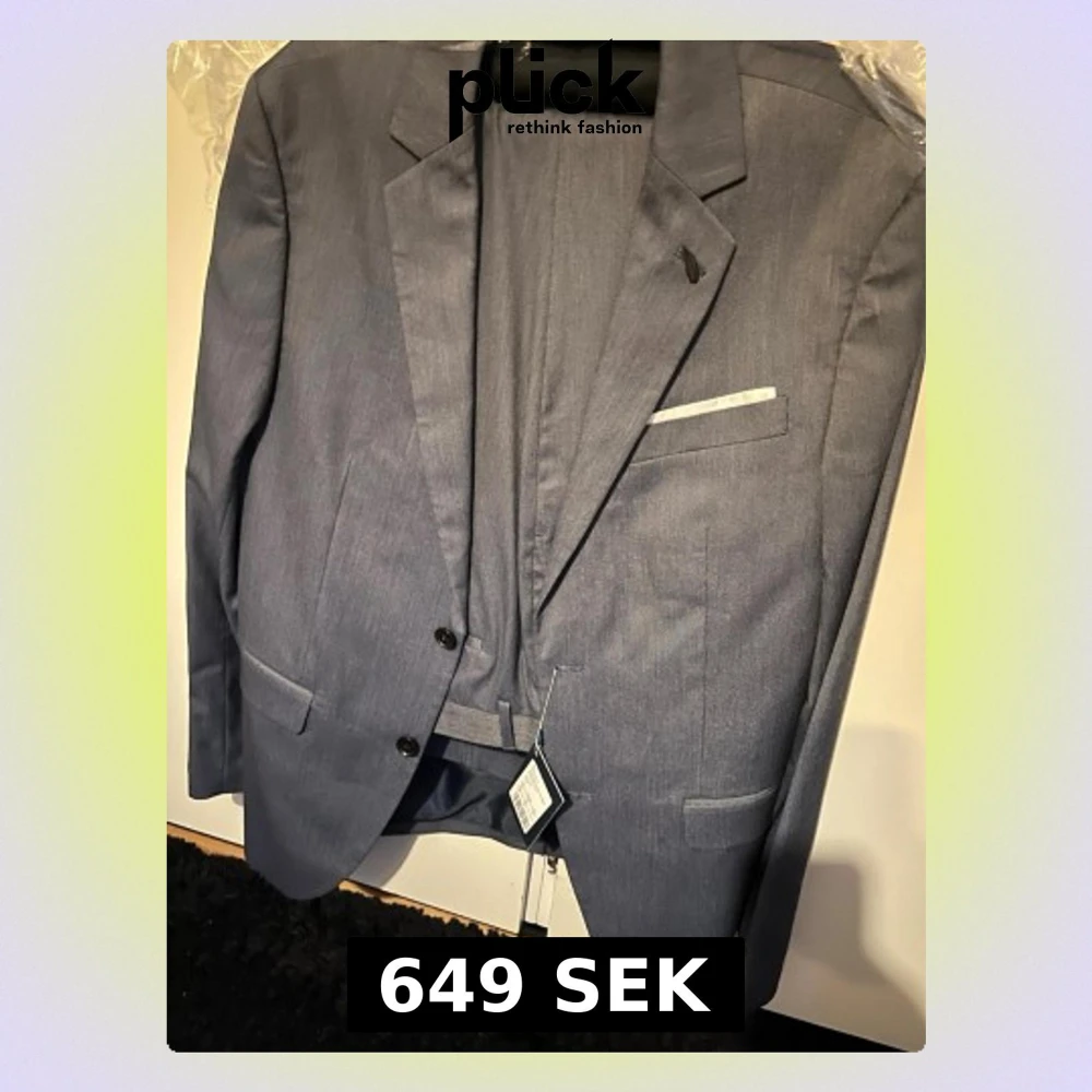 Snygg blå kavaj med två knappar framtill och klassiska slag. Kavajen har en bröstficka med vit näsduk och två fickor med lock. Materialet ser ut att vara slätt och lätt, perfekt för en stilren look.