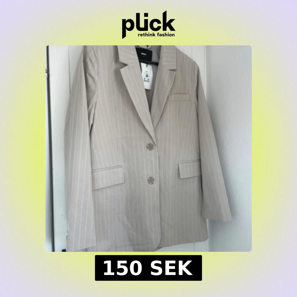 Snygg beige kavaj med tunna vita ränder och två knappar framtill. Klassisk krage och fickdetaljer, perfekt för dig som gillar en stilren look. Passformen är normal och materialet känns lätt och bekvämt. Enkel att matcha med jeans eller kostymbyxor.