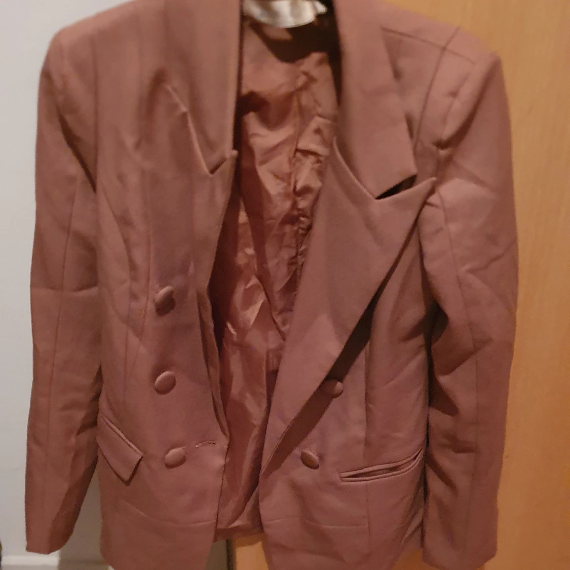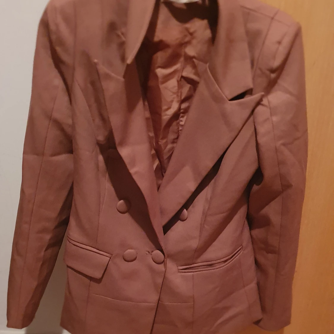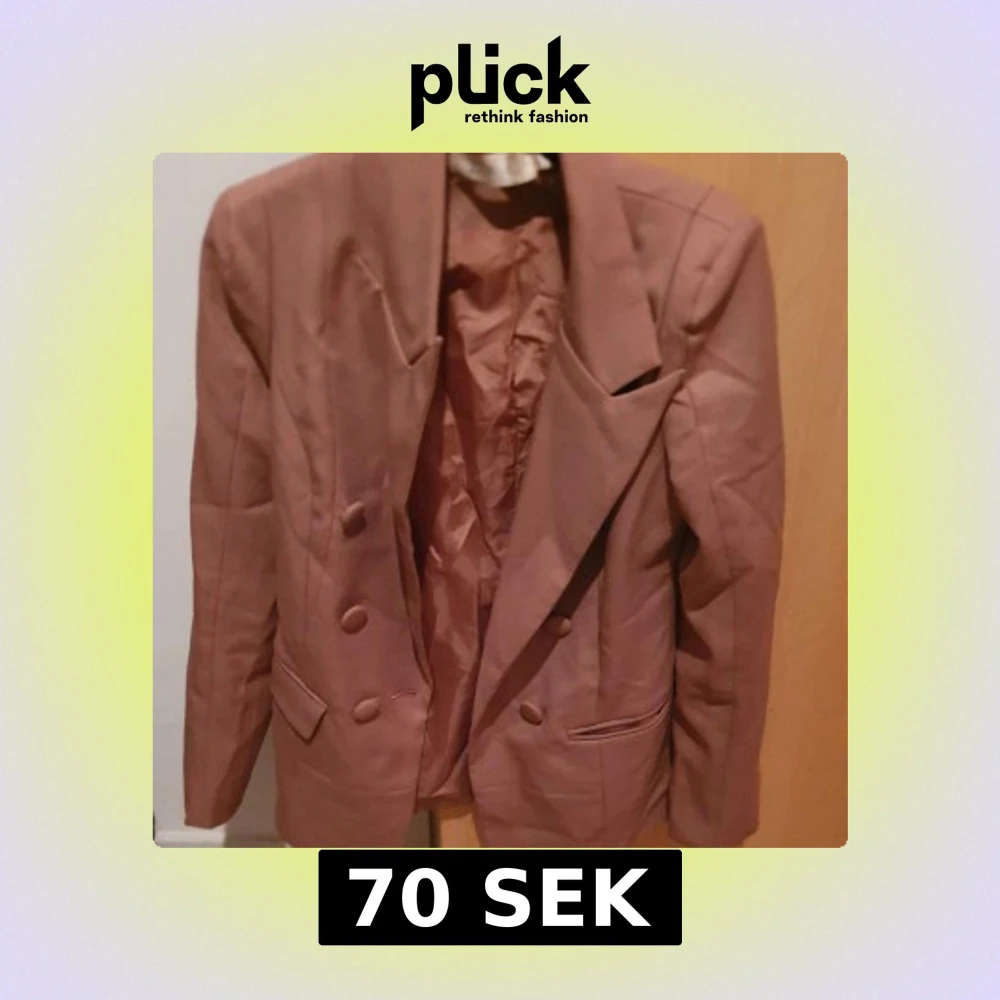 Säljer en brun kavaj i storlek M. Kavajen har dubbelknäppning med matchande bruna knappar, klassisk krage och två fickor framtill. Materialet känns som polyester och passformen är normal. Perfekt för dig som gillar stilrena och tidlösa plagg.