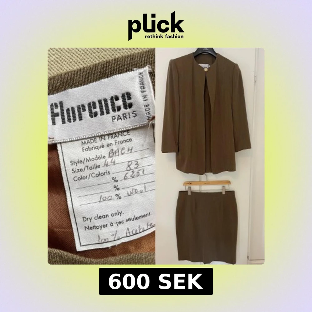 Helt unikt vintageset med handskriven etikett i från Florence Paris i 100% ull. Setet består av en rak kavaj med dekorativa ljusa knappar och en matchande pennkjol. Perfekt för dig som gillar stilrena och tidlösa plagg med unika detaljer. Kavajen har en enkelknäppning fram men sen dubbelknäppning under med fint fall och dekorativa knappar vid ärmsluten. Kjolen en klassisk modell med dragkedja och litet sprund baktill.