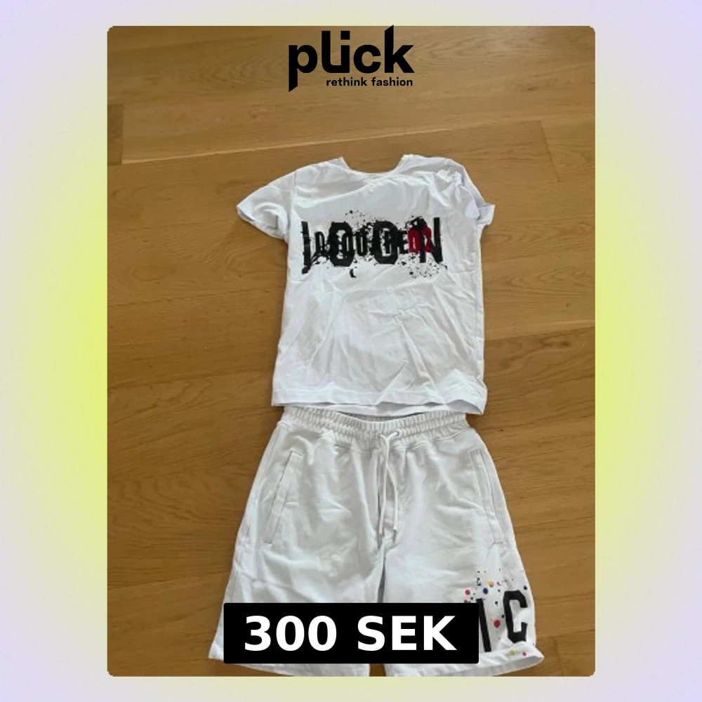 Säljer ett fräscht vitt set från Dsquared2 med t-shirt och shorts. T-shirten har tryck i svart och rött framtill, och shortsen har elastisk midja med snörning samt tryck och färgstänk på ena benet. Perfekt för chill dagar eller sommarhäng.