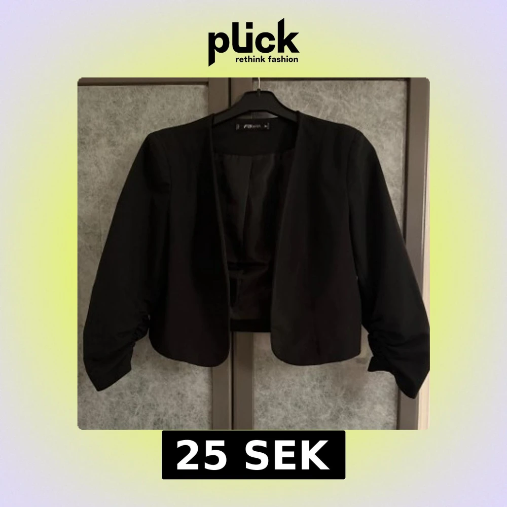 Elegant svart kavaj från FB sister med en stilren design. Kavajen har halvlånga ärmar med rynkade detaljer vid ärmsluten, vilket ger en unik touch. Perfekt för att komplettera en chic outfit. Innertyget i ärmslutet på båda ärmarna har gått sönder. Inget som syns och inget som påverkar användandet. Se bilder.