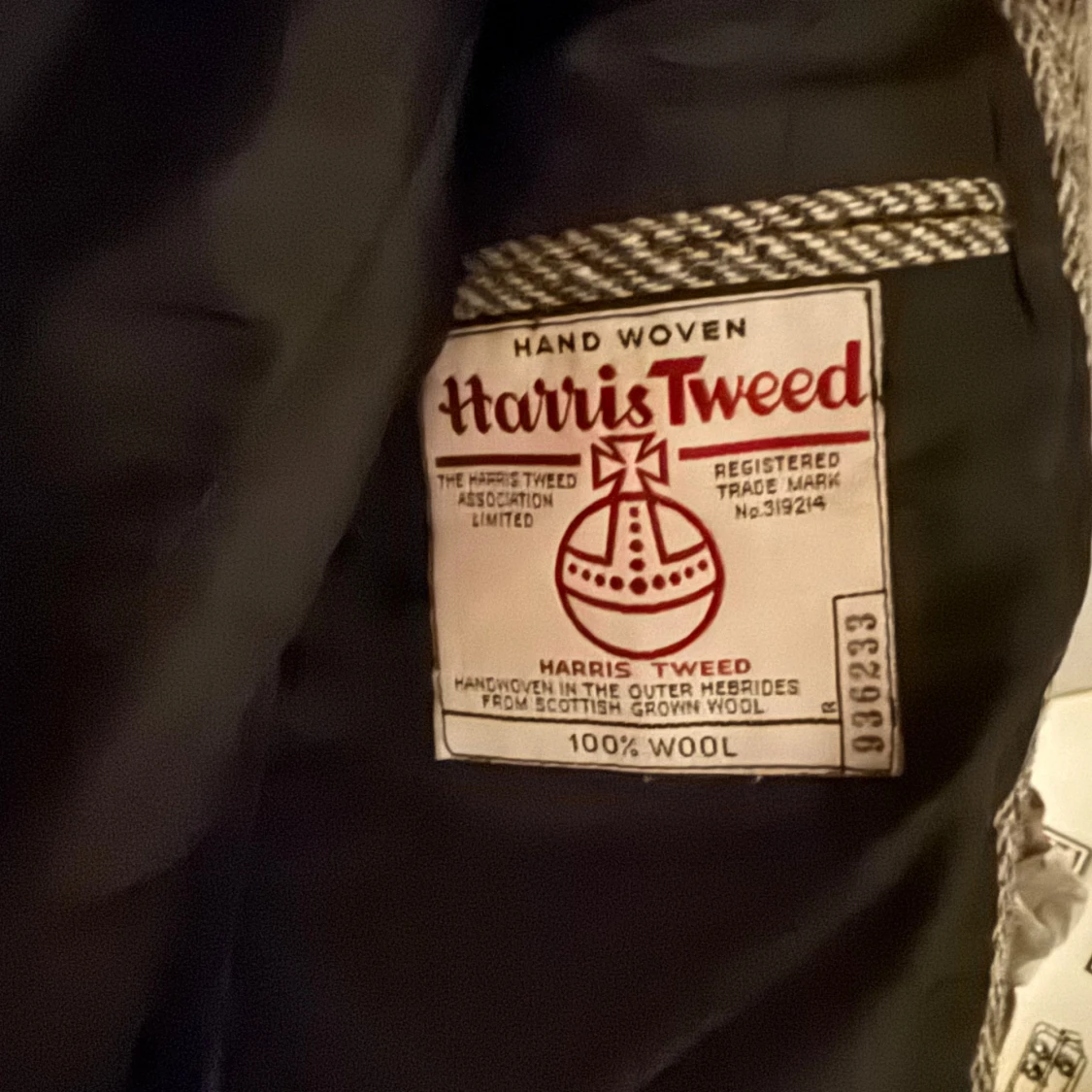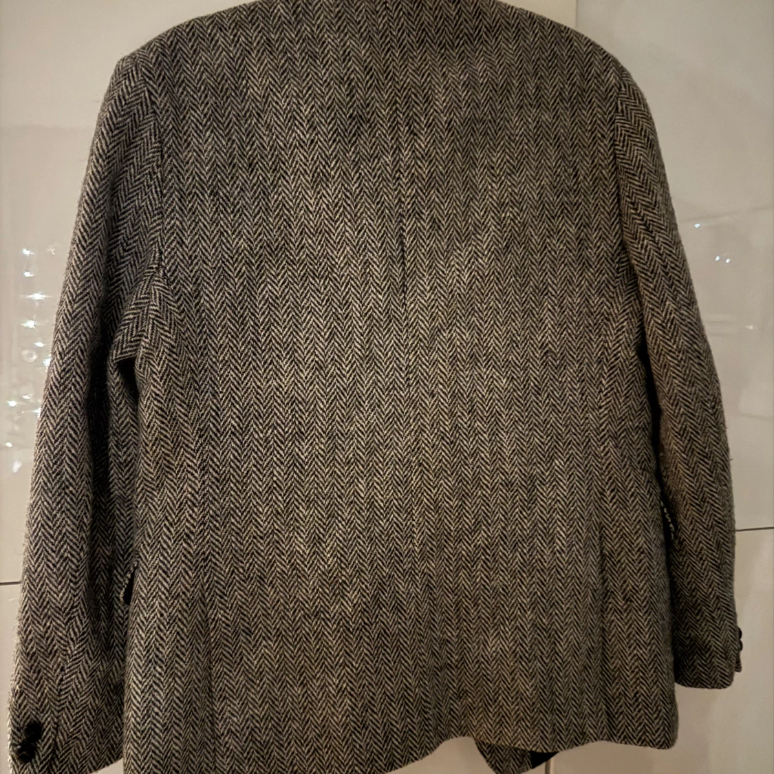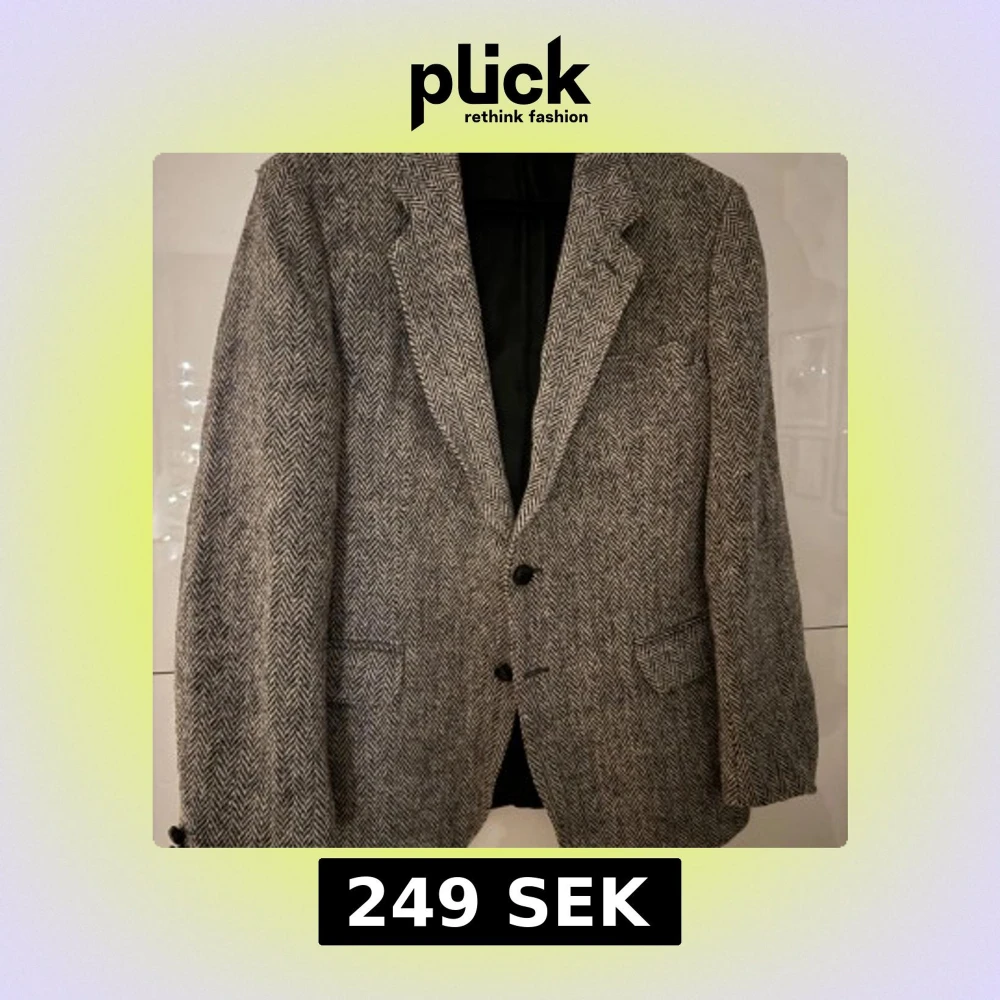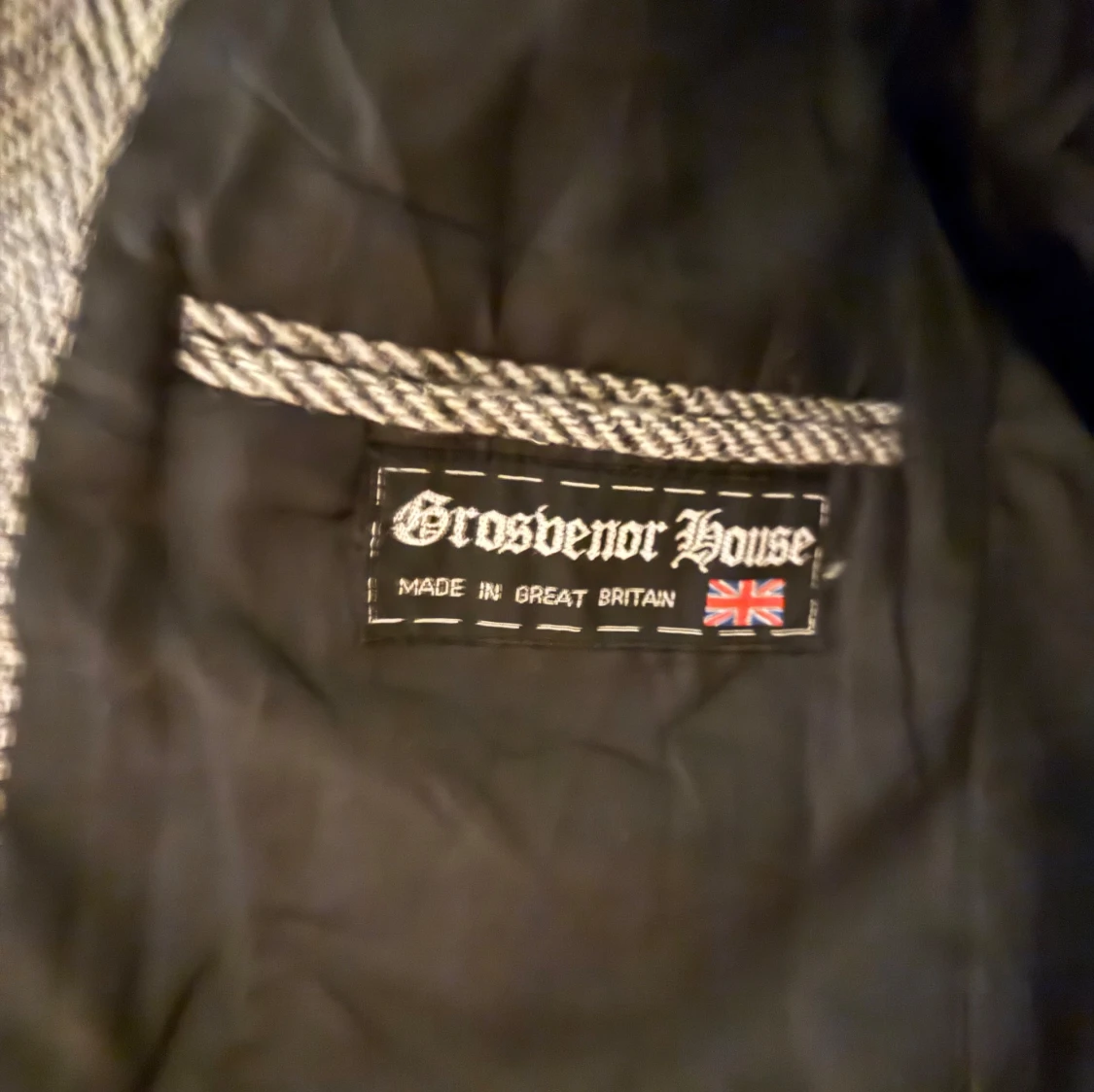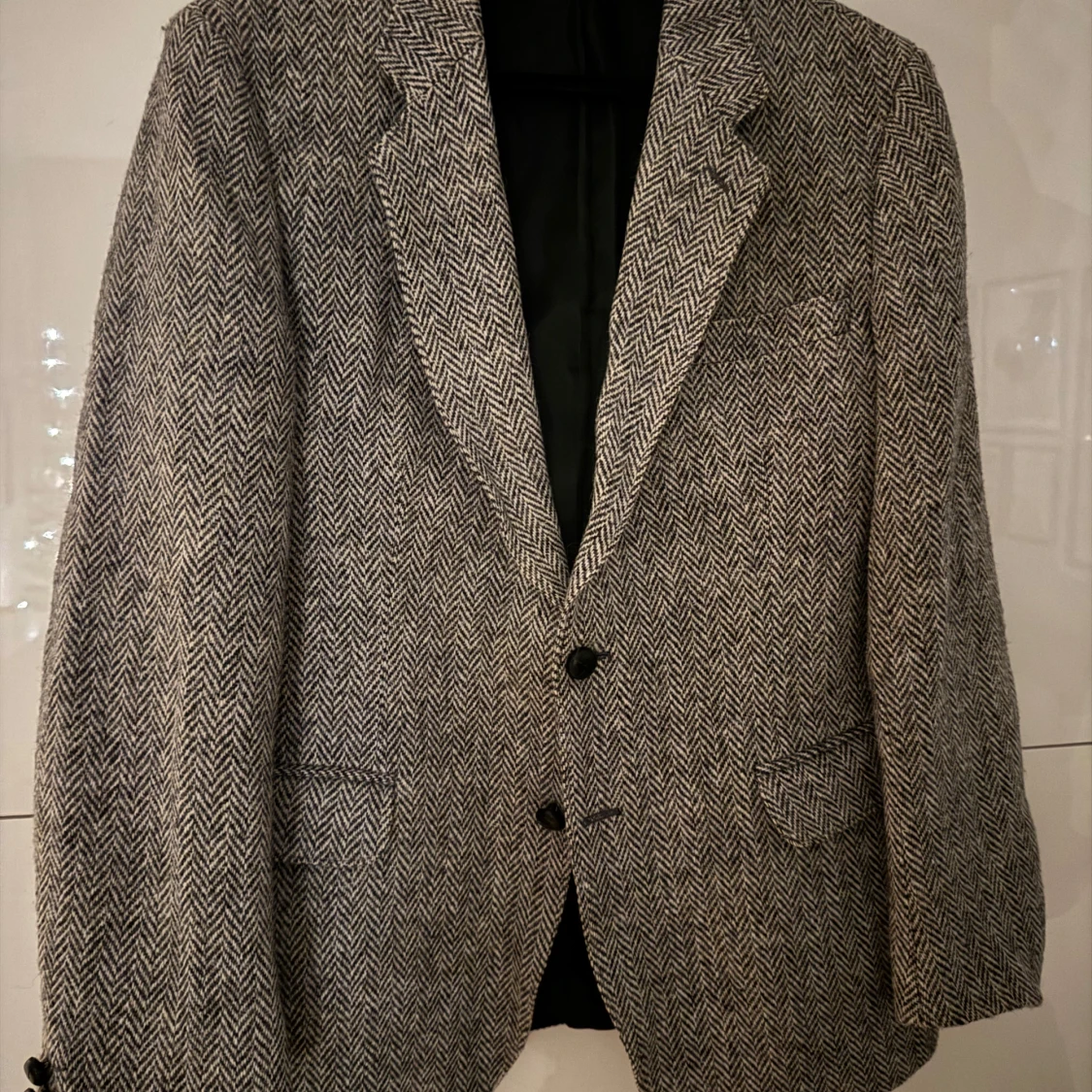 Säljer en stilren grå kavaj från Grosvenor House, tillverkad av 100% ull från Harris Tweed. Kavajen har ett klassiskt fiskbensmönster och två knappar framtill. Perfekt för en elegant look.