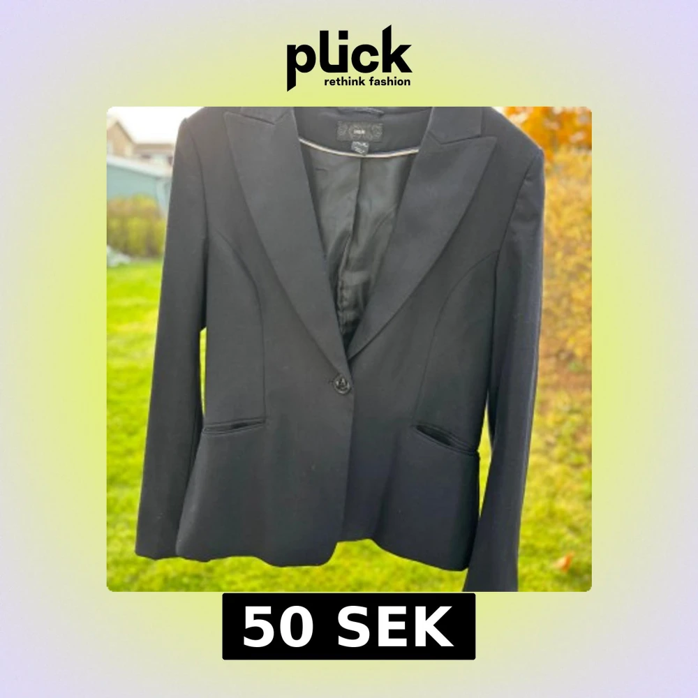 Klassisk svart kavaj från H&M i storlek 40. Snyggt skräddad med spetsiga slag, en knapp framtill och två fickor. Fodrad insida för extra komfort. Perfekt för en stilren look och enkel att matcha med olika outfits.