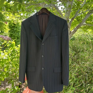Super fin kavaj i nyskick från Hugo Boss. Randig (som på bilderna) med vadderade axlar i storlek L. Kontakta gärna vid frågor och mer bilder!